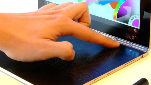 Společnost Lenovo dnes na veletrhu IFA představila pozoruhodné zařízení pojmenované Yoga Book. Na první pohled vypadá jako klasický desetipalcový laptop, ovšem na základně zcela chybí mechanická klávesnice; ta je nahrazena velkou dotykovou plochou, která reaguje na různé úrovně tlaku. Tuto plochu lze použít i jako klávesnici, stačí stisknout jedno tlačítko a na černé ploše se objeví podsvícená písmenka. Klávesnice při psaní poskytuje vibrační odezvu, překlepy eliminuje prediktivní slovník.