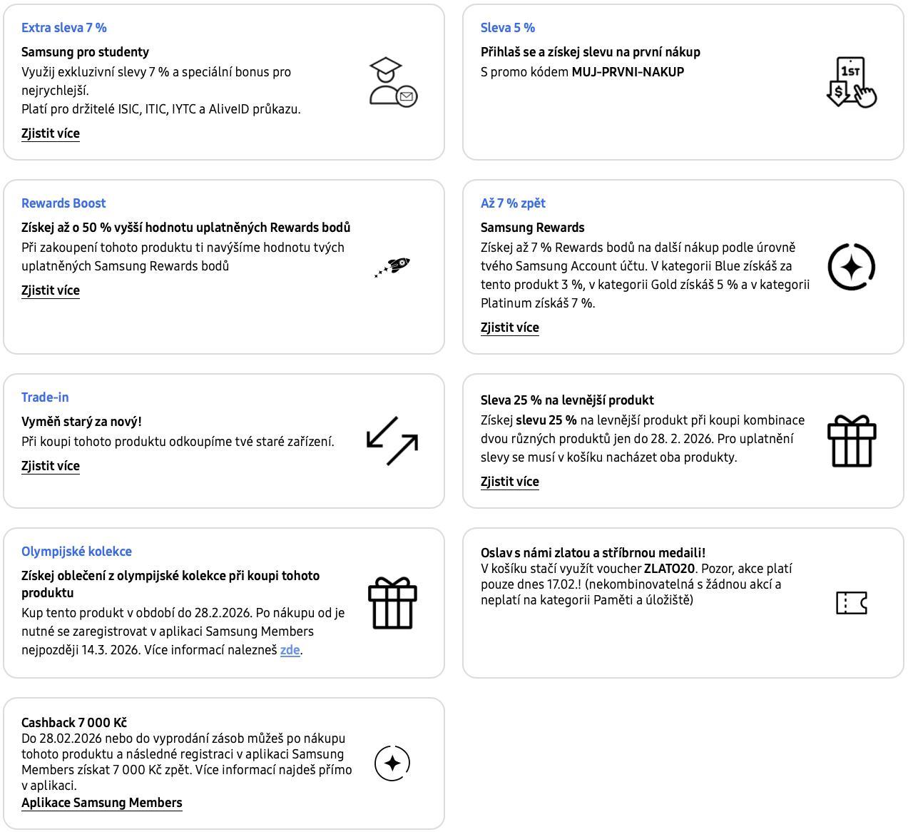 Kdybyste měli v plánu kupovat více produktů od Samsungu, můžete se až do 28. února těšit na příjemnou slevu 25 % na levnější produkt v košíku. V rámci aktuálně probíhající zimní olympiády navíc při nákupu vlajkových modelů můžete až do 28. února získat oblečení z olympijské kolekce, pakliže se nejpozději do 14. března registrujete do Samsung Members. Perličkou je i exkluzivní sleva v případě, kdy naši olympionici dosáhnou na zlatou či stříbrnou medaili, kdy máte po omezenou dobu s kódem ZLATO20 (nekombinovatelná s žádnou akcí a neplatí na kategorii Paměti a úložiště) možnost dosáhnout na 20% slevu.