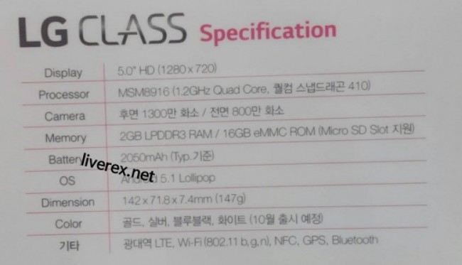 LG Class bude schopný tvořit 8Mpx selfies, zadní fotoaparát bude připraven na tvorbu 13Mpx fotografií. Své místo najde ve vystouplém modulu, jehož součástí bude i přisvětlovací dioda a tlačítka pro zamknutí telefonu a změnu hlasitosti.