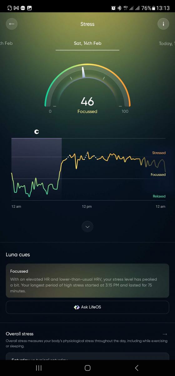 O komunikaci mezi telefonem a Lunou se stará aplikace nazvaná překvapivě Luna Ring. I tady se projevuje zásadní rozdíl oproti chytrým hodinkám. Ty jsou většinou postavené na myšlence nabídnout základ a rozšíření nechat na vývojářích aplikací. Prsten vyžaduje, aby si vzal veškerou zodpovědnost na svá bedra výrobce. A on těch metrik a informací podává tolik, že ani po dvou týdnech si nejsem jistý, že jsem potkal aspoň 80 % možností.