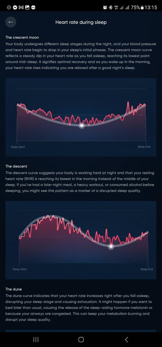 Nejvíc se mi ale líbila forma, jakou vám aplikace Luna Ring všechna ta čísla servíruje. Ku pomoci vám jsou tři nástroje. Pro každou oblast vidíte základní údaje – v případě spánku třeba vidíte čas spánku, doporučenou délku spánku a dobu v jednotlivých fázích. To dělá skoro každý fitness tracker. Luna ale hned vedle ukáže, že ve dvou metrikách jste se odchýlili od průměru. Nejdřív vás to vyděsí, už vyhlížíte infarkt, ale jak je každá nabídka proklikávací, začínáte své tělo objevovat novým způsobem.