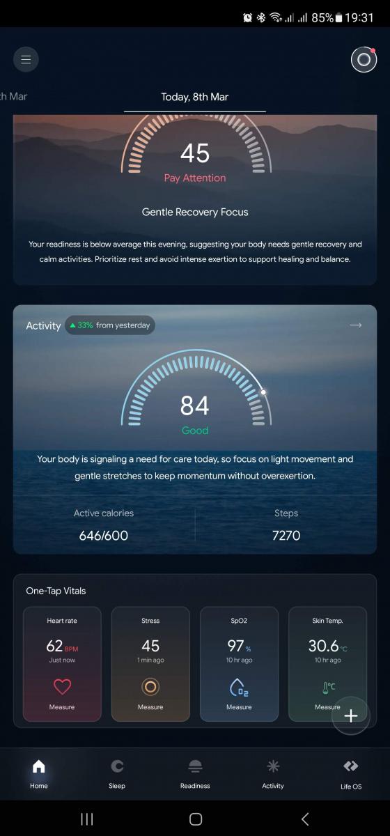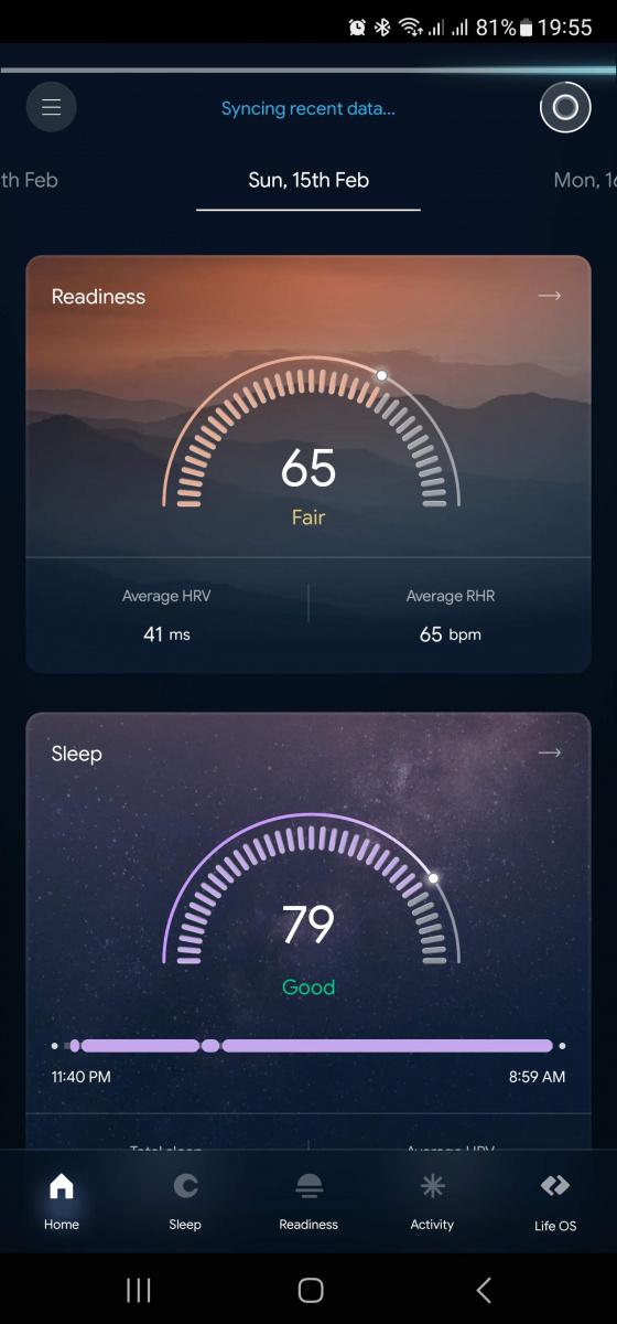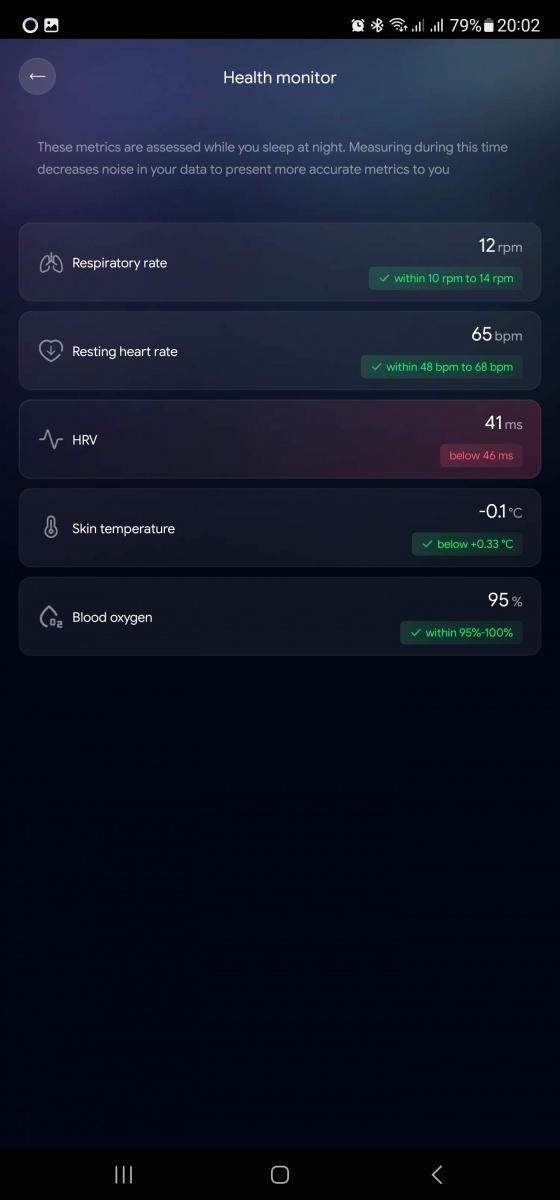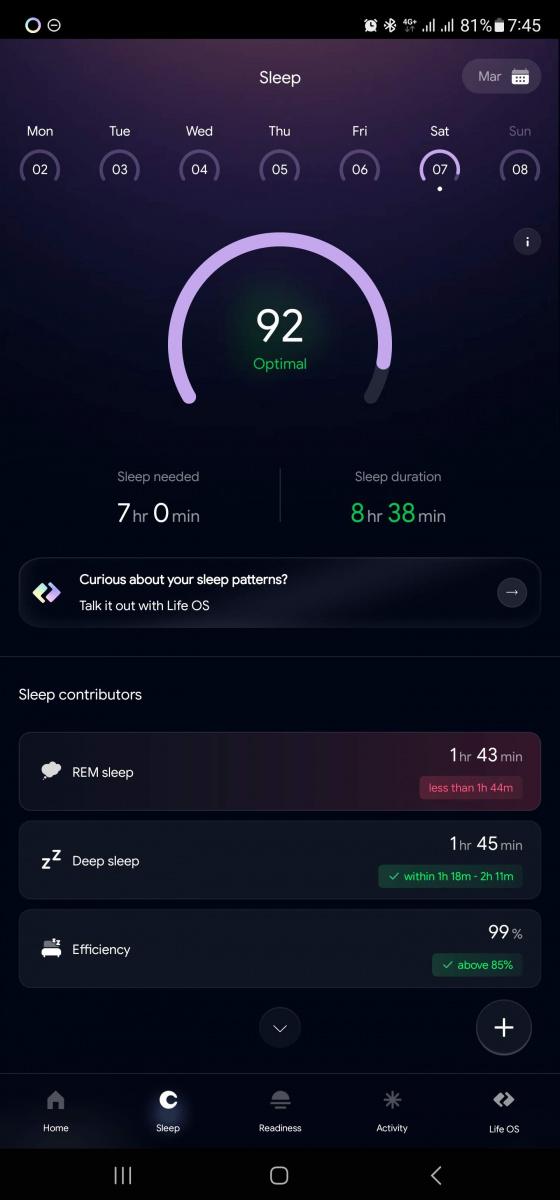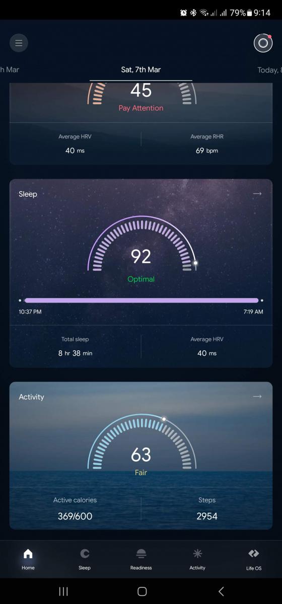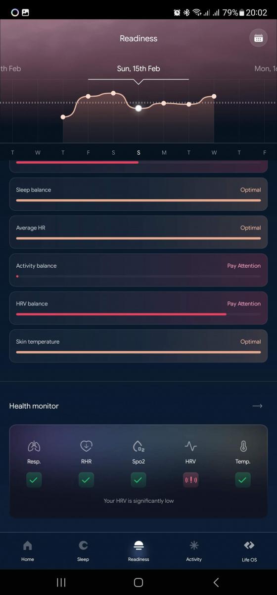 Hodnocení životosprávy se skládá ze tří hlavních faktorů: připravenost , spánek a aktivita. Tyto metriky jsou každý den hodnoceny na stupnici od 0 do 100 bodů a pro každou jsou hlavní dvě naměřené hodnoty. Pro připravenost je to variabilita srdečního tepu a klidová frekvence, pro spánek pak jeho délka a (znovu) variabilita tepu, pro aktivitu pak spálené kalorie a kroky. Pod každou škatulkou je ale širší datová základna. Měří se tělesná teplota, rychlost dýchání, spánkové fáze, klidová tepovka, okysličení krve a čert ví, jestli i to je všechno.