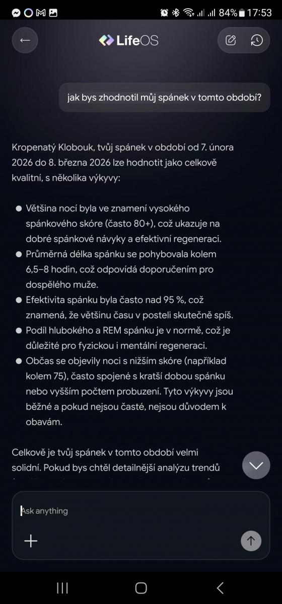 Vrhnul jsem se proto na její interpretaci dat, která o mě prsten nasbíral. Hezky česky, mírně polopaticky. Občas AI haprovala, když mi nechtěla odpovídat jen proto, že neměla data z nedávné minulosti. Jakmile jsem se ale zeptal, ze kdy data má a co mi k nim řekne, chytla se a dokázala všechny ty grafy do pár odrážek shrnout. Pokud vám proto nic neříkají tabulky, čísla a diagramy, LLM vám to převypráví běžnou češtinou.