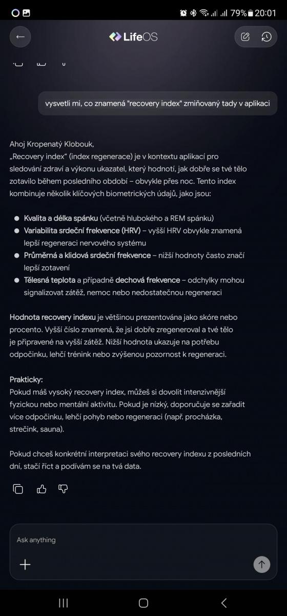 Dostáváte se tím ale do trošku schizofrenní situace, kdy aplikace operuje s pojmy jako recovery index, sleep score, training volume apod. v angličtině, ale pomocí chatbota vám dokáže jednotlivé metriky vysvětlit. K jazykové vybavenosti bych byl však tentokrát shovívavější, prsten nepovažuji úplně za mainstreamový hardware a divil bych se, kdyby se i kvůli své ceně objevoval na prstech někoho, kdo aspoň trochu angličtinou nevládne.
