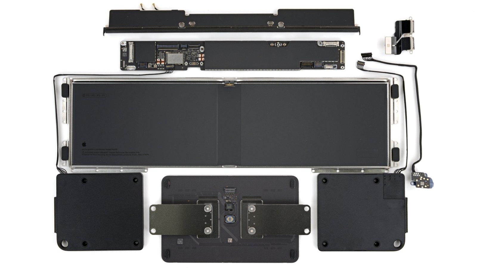 Po sejmutí krytu je jsou okamžitě přístupné porty, reproduktory, trackpad i baterie, přičemž právě akumulátor se stal hlavní hvězdou testu. Apple ji totiž k tělu počítače nepřilepil, ale osadil ji do snadno odmontovatelné vaničky uchycené 18 šrouby. Firma z Cupertina se pravděpodobně připravuje na nové nařízení EU o bateriích, které bude od příštího roku vyžadovat u mobilních produktů uživatelsky vyměnitelné akumulátory. Dá se tedy předpokládat, že výměna akumulátorů bude brzy snadná i u dalších jablečných produktů.