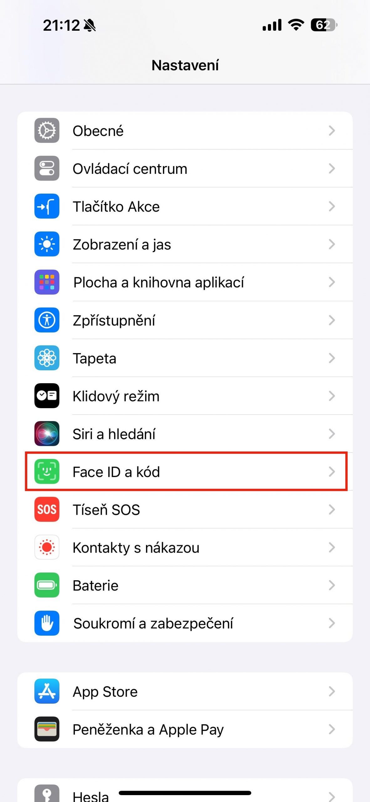 - Vyberte možnost Face ID a kód, popřípadě Touch ID a kód