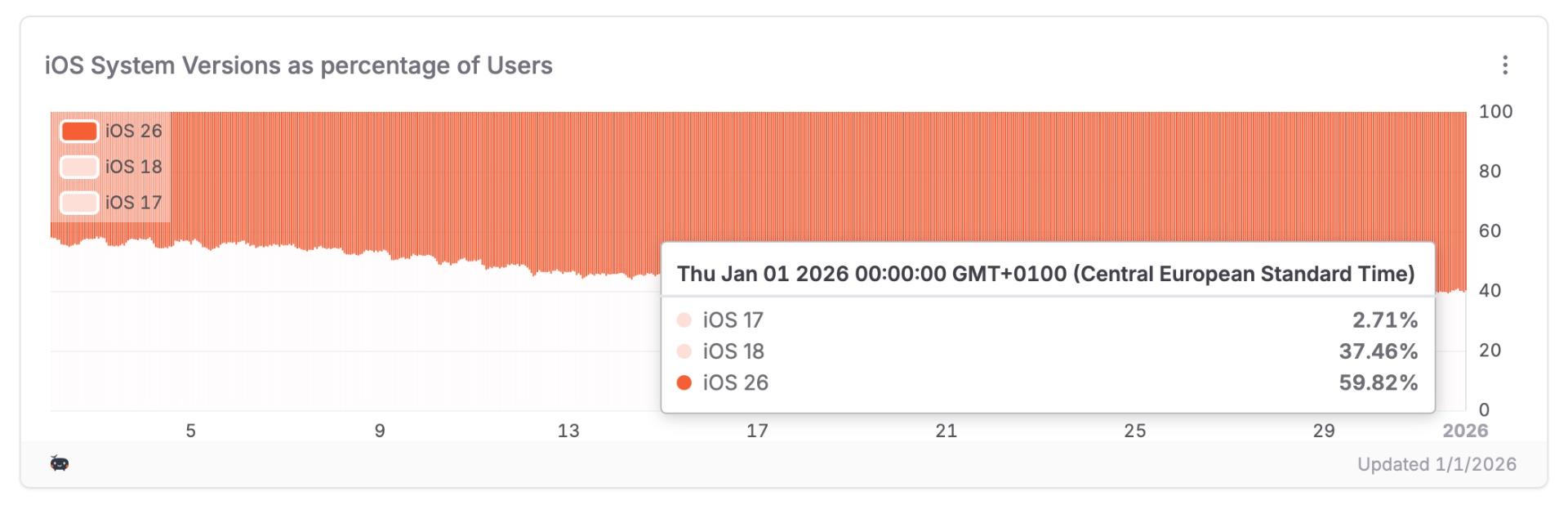 Ve srovnání s loňským lednem působí iOS 26 jako propadák, protože tehdy nejnovější verze iOS 18 disponovala podílem na trhu přes 60 %, iOS 17 byste pak v lednu 2024 našli na více jak 50 % iPhonů. Faktem je, že iOS 26 představuje takřka revoluční aktualizaci, která mění design celkového uživatelského prostředí a odpůrci velkých změn tak mohou s aktualizací vyčkávat. Update byl oznámen na WWDC 25 v červnu, ke stažení byla první oficiální verze od poloviny září.