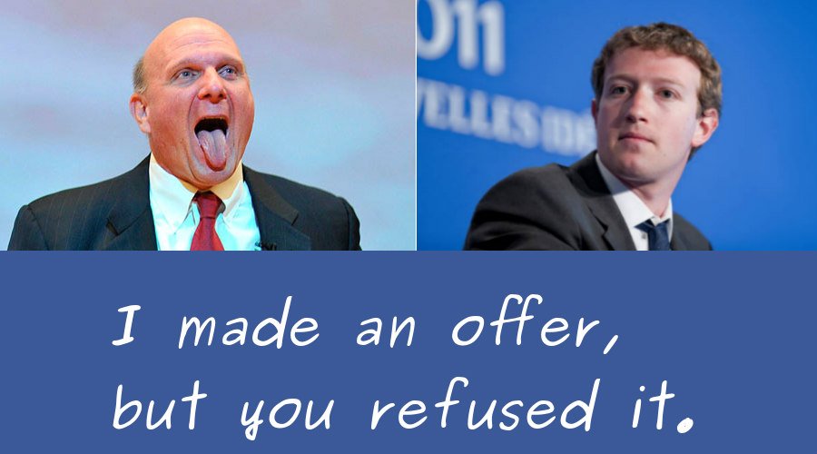 Steve Ballmer, americký manažer a bývalý výkonný ředitel společnosti Microsoft, uvedl v rozhovoru pro CNBC, že v roce 2010 jednal s Markem Zuckerbergem o odkupu sociální sítě Facebook. Nabídka byla přitom velkorysá, ale Zuckerberg cítil, že má Facebook daleko větší potenciál a nabídku odmítl.