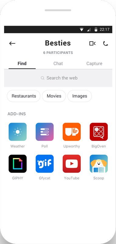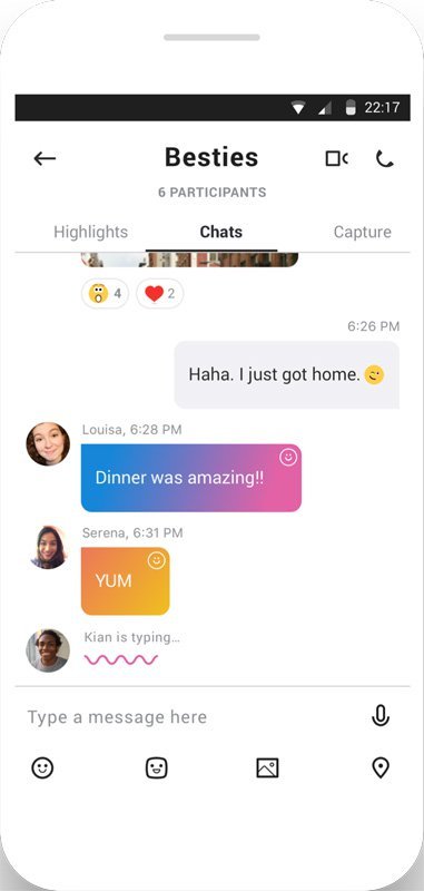 V chatu lze využívat nových interaktivních prvků, jakými jsou animované reakce, emotikony, nálepky, videa z YouTube a další způsoby známé z konkurenčních aplikací. Nová funkce Capture po vzoru Snapchatu nabízí možnost okamžitě spustit fotoaparát vytvořit pro druhou stranu sadu obrázků nebo video, které lze ještě před odesláním patřičně doupravit.
