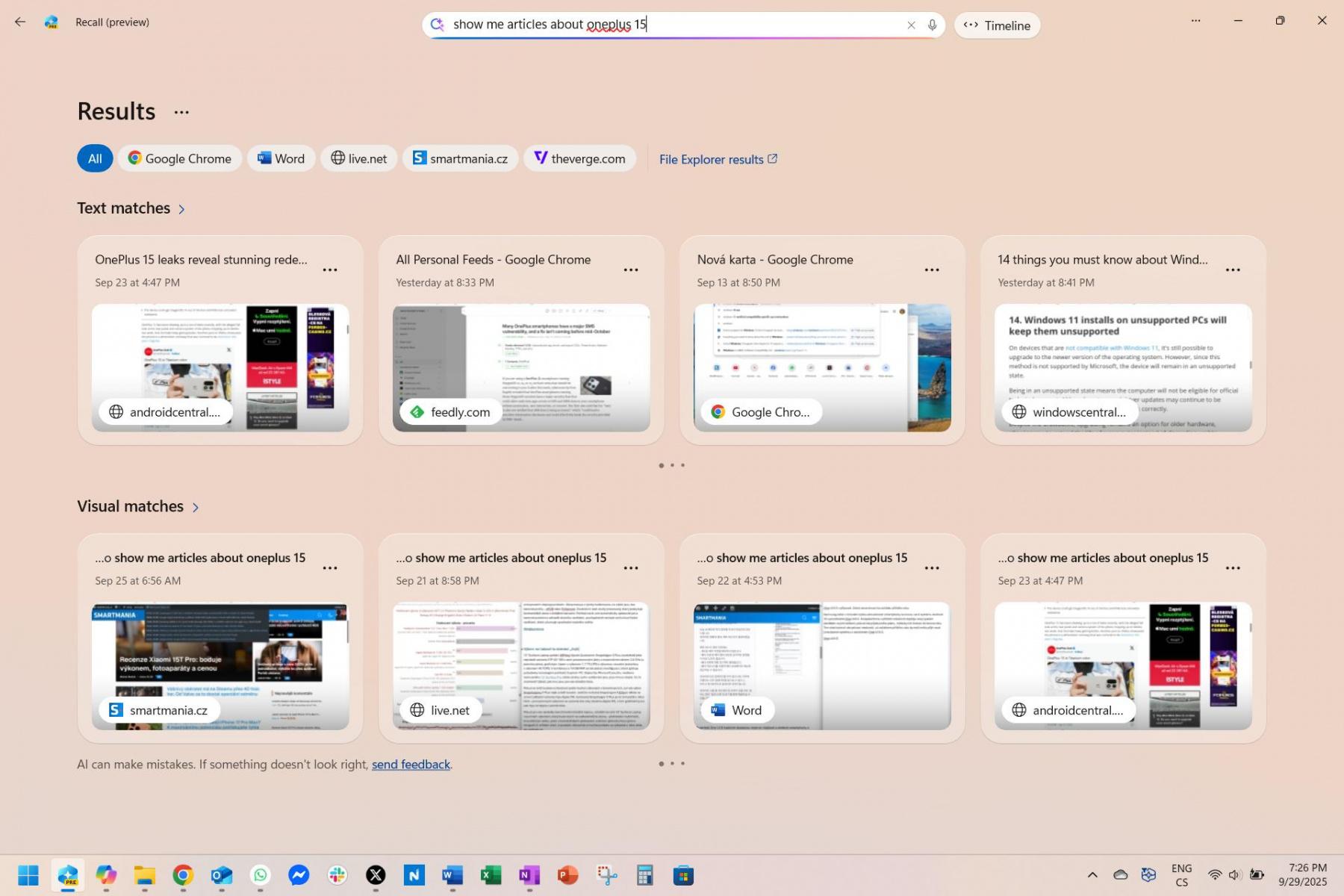 Výsledkem je pak výčet, který umělá inteligence vytvoří na základě textových nebo vizuálních shod. Z nabídnutých obrázků lze přímo kopírovat text, pokud se shoda týká webové stránky, lze ji znovu navštívit na základě rozpoznané webové adresy. Recall funguje velmi pohotově, vyhledávání čehokoliv v historii je dílem okamžiku. Prohlížet historii lze i skrze časovou osu snímek po snímku.