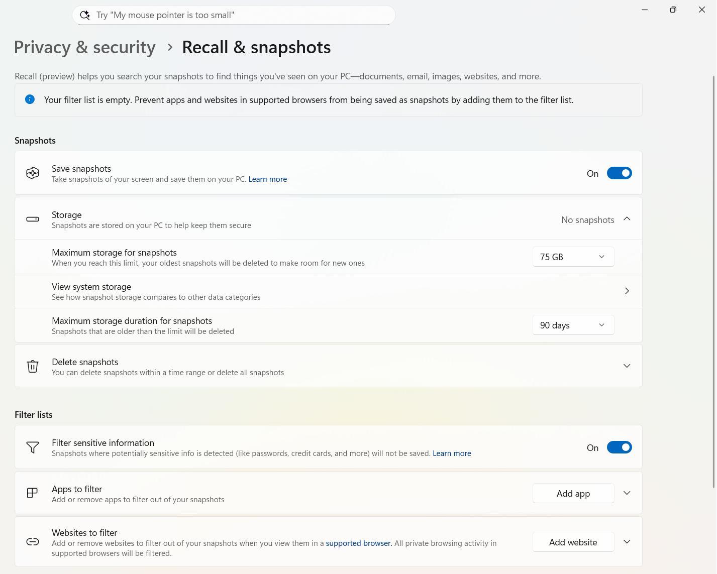 Pro zvýšení bezpečnosti Microsoft učinil několik opatření – lze si vybrat aplikace či webové stránky, které Recall nebude fotit, každé otevření aplikace Recall navíc vyžaduje přihlášení. Funkci lze rovněž přiřadit maximální možný prostor na úložišti, anebo omezit, do jak vzdálené historie může fotografie ukládat.