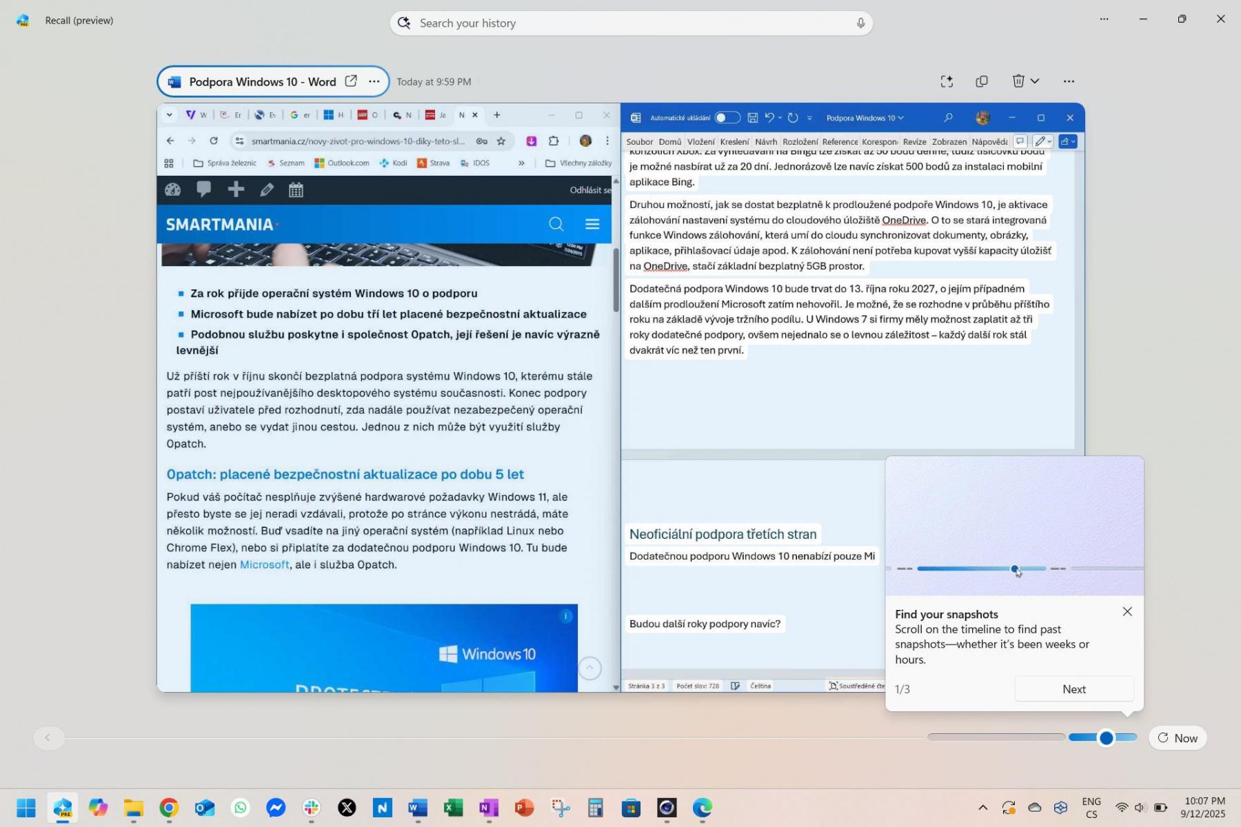 Recall měla být výkladní skříň umělé inteligence na Copilot+ počítačích, avšak po úvodním bezpečnostním fiasku ji Microsoft nasadil výrazně později a pouze na omezeném množství trhů. Recall je fotografická paměť počítače, která každou chvíli ukládá snímek obrazovky, přičemž v této galerii pak může „šmejdit“ umělá inteligence. S její pomocí pak můžete zpětně v historii vyhledávat přirozeně pokládanými větami, např. „ukaž mi články o Windows 11, které jsem četl minulý týden“.