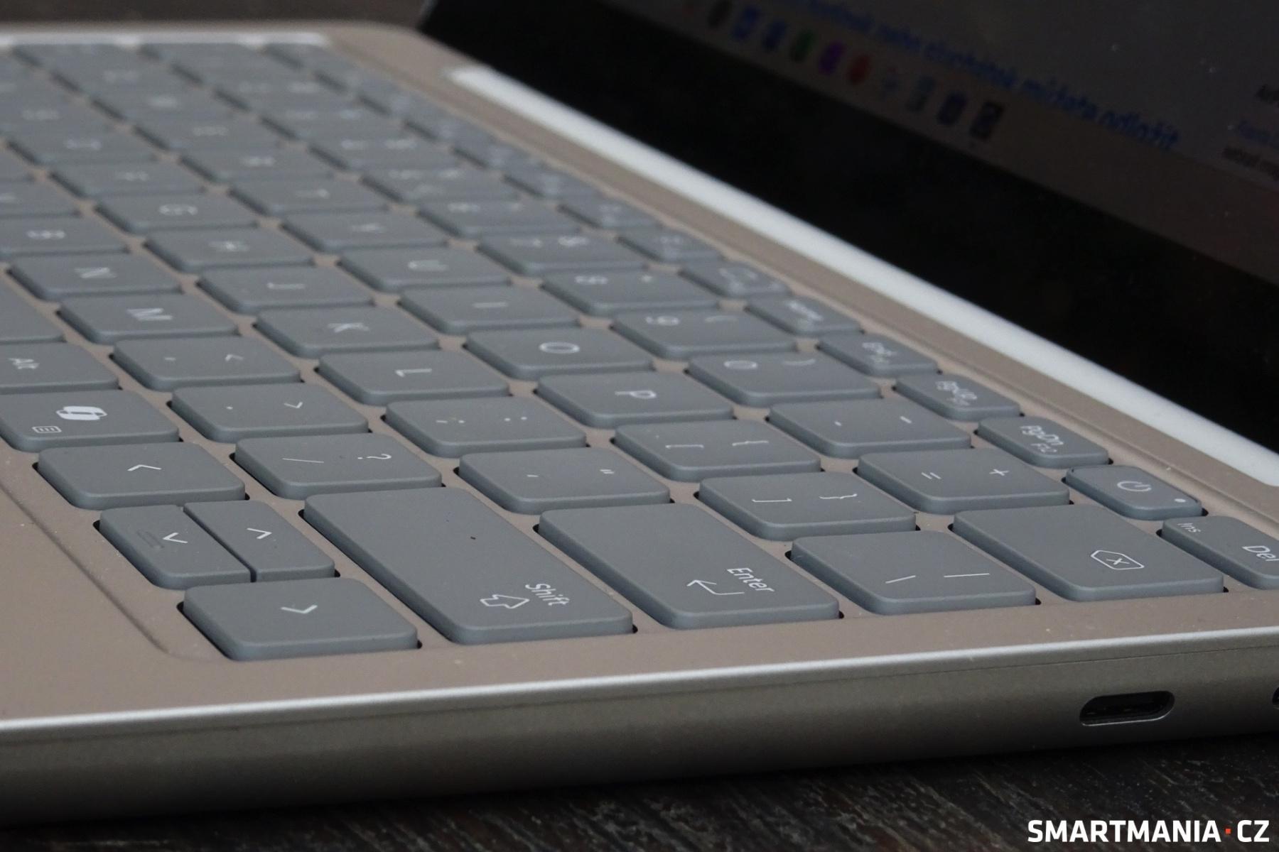 Velkou pochvalu si zaslouží i klávesnice, které v Microsoftu zkrátka umí. Oproti minulým modelům jsou sice jednotlivé klávesy o něco menší a zaoblenější, mé vycvičené prsty se ale do nich strefovaly bez jakýchkoliv překlepů. Jistotě psaní napomáhal i příjemně dlouhý a jasně zřetelný stisk doprovázený jemným a tichým kliknutím. Microsoft se také poučil z ohromné chyby Surface Laptopu Go a klávesnici 13″ Surface Laptopu podsvítil – rovnoměrně a regulovatelně ve třech stupních. Stále však přetrvává nedostatek v podobě absence českých znaků.