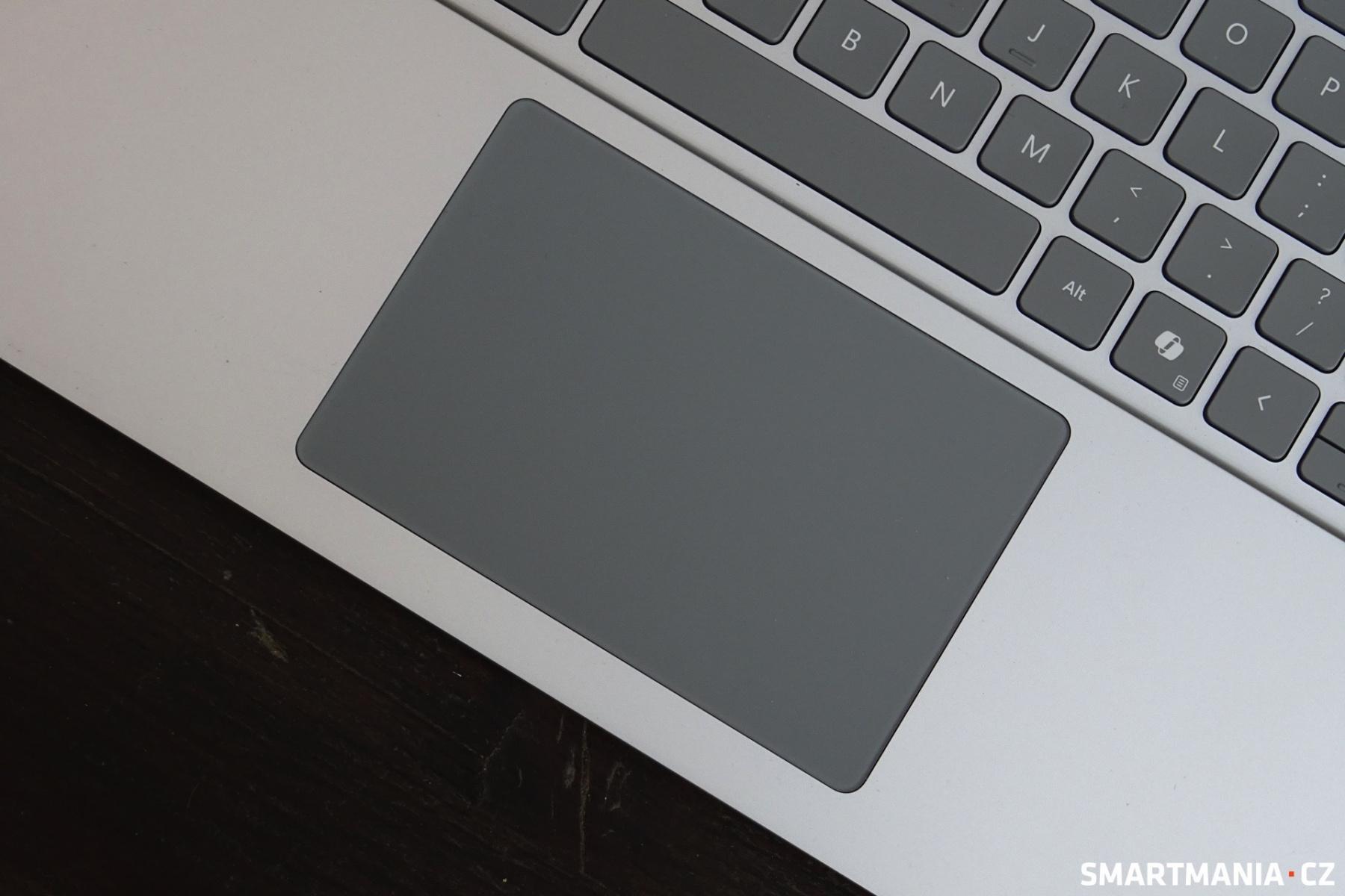 Úsporné opatření Microsoft aplikoval i na touchpad, který není haptický, ale po staru mechanický. Tento ústupek trochu zamrzí, ale při používání to naštěstí nijak nevadí – počítač se i s mechanickým touchpadem ovládá dobře a přesně, systém Windows navíc dává (oproti macOS) uživateli absolutní svobodu při nastavení vícedotykových gest. Já například s oblibou tažením čtyř prstů nahoru/dolů měním hlasitost, tažením doleva/doprava pak připínám okna aplikací ke stranám obrazovky. Možnosti nastavení jsou ale prakticky nekonečné.