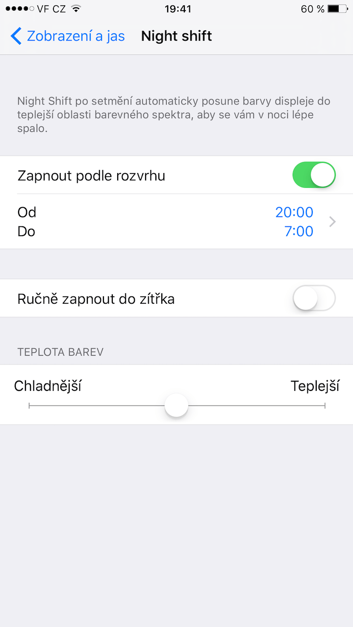 Night Shift lze zapnout buď manuálně vysunutím Ovládacího centra ze spodní části obrazovky, anebo ji můžete nechat pracovat automaticky v závislosti na vámi zvoleném rozvrhu. Samozřejmostí je i manuální úprava teploty barev nebo volba pro aktivaci funkce od soumraku do úsvitu (položka Ručně zapnout do zítřka).