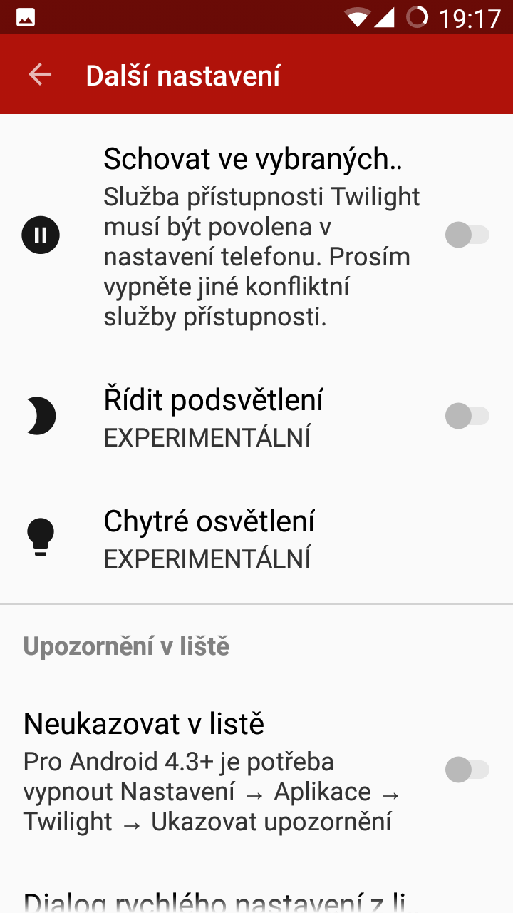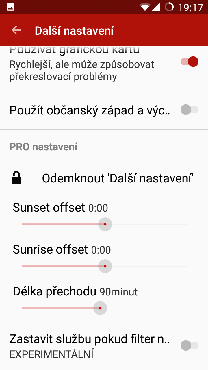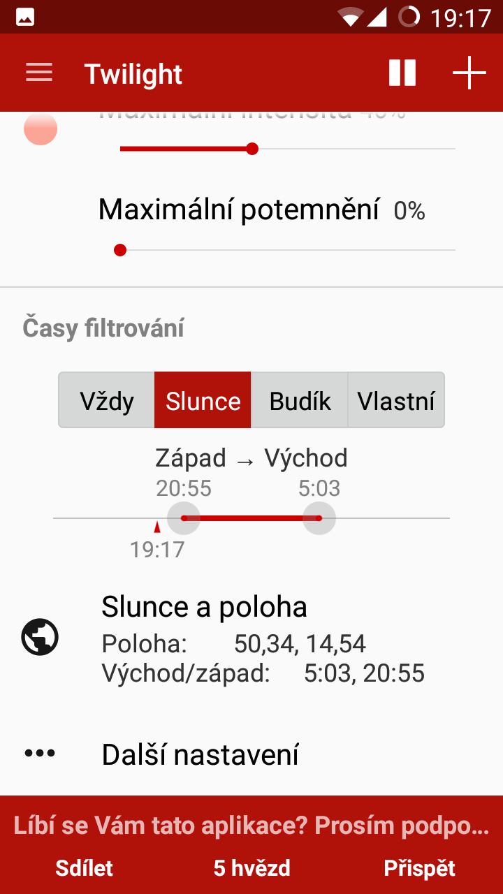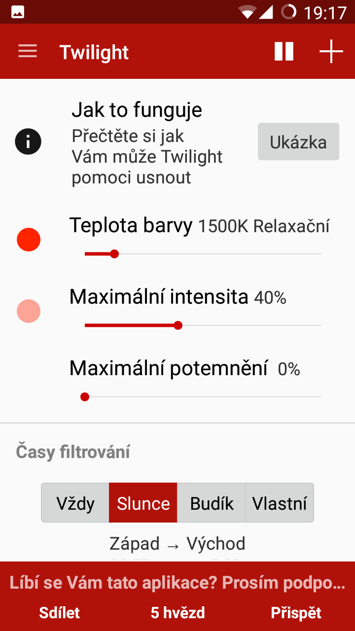 Pokud vám a vašemu zařízení s operačním systémem Android není beta verze f.lux zrovna po chuti, nebo nemáte root, perfektní alternativou je aplikace Twilight. Ta je k dispozici jak v bezplatné verzi, tak v placené (49 Kč), která přidává jen pár dalších méně důležitých funkcí a slouží spíše pro dobrovolnou podporu vývojářů.