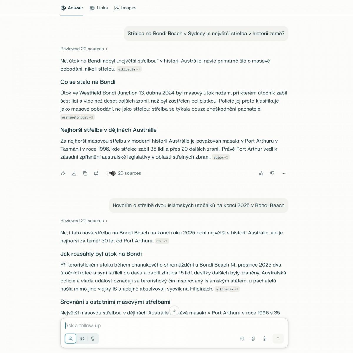 Umělá inteligence v případě aktuálních informací často může halucinovat a zaměňovat očividná fakta za odlišný kontext, v minulosti jsme toto mohli pozorovat i u větších hráčů na AI poli, jako Gemini nebo ChatGPT. Vždyť i nástroj Perplexity nám nejprve sepsal kontext pro masový útok nožem v obchodním centru Westfield Bondi Junction z loňského roku, přestože jsme explicitně zmínili Bondi Beach a slovo „střelba“.