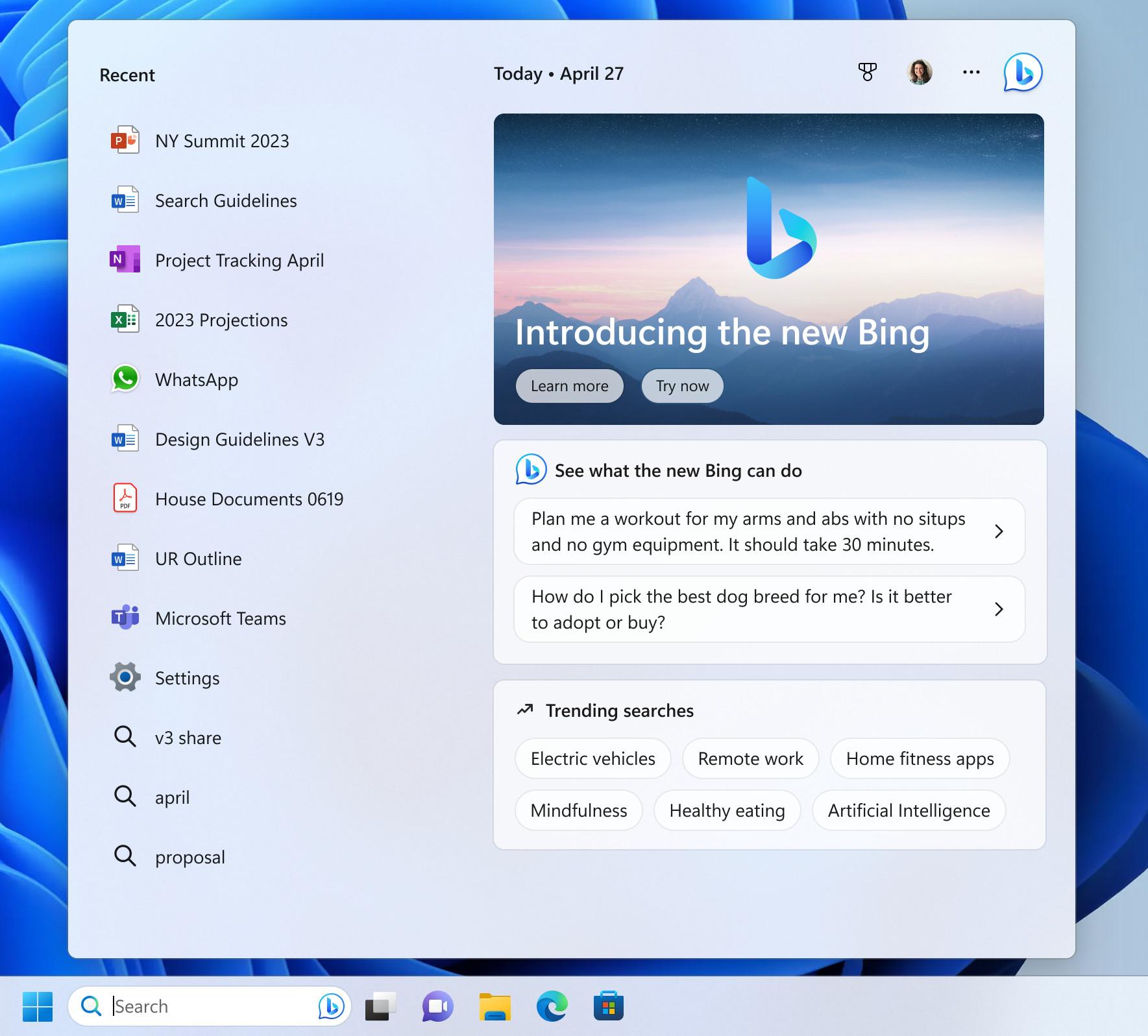 Pravděpodobně největší překvapení se odehrálo na hlavním panelu, kam Microsoft dosadil nový Bing poháněný umělou inteligencí. Namísto ikonky s lupou lze nově v hlavním panelu zobrazit vyhledávací řádek, a přímo do něj zadávat sofistikovanější dotazy, odpovědi pak budou přicházet přímo v práci vyhledávacího okna.