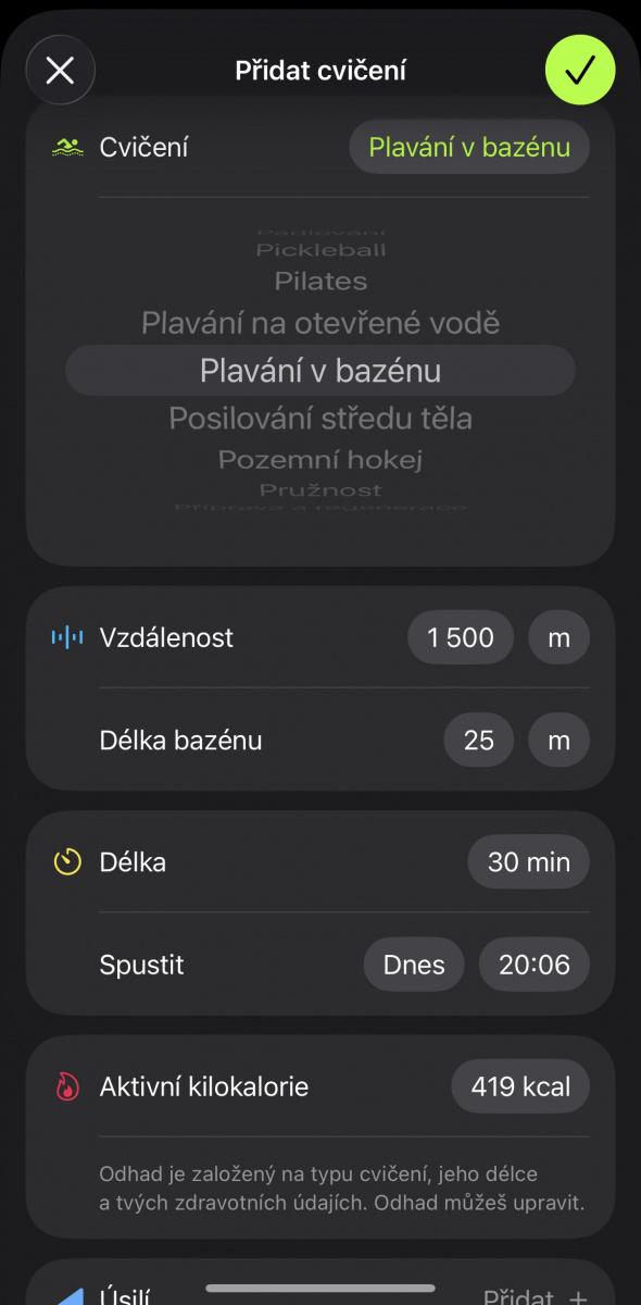 U každé aktivity se liší možnosti, které můžete zpětně zaznamenat. Například v případě veslování na vodě lze zadat vzdálenost a délku a u plavání bazénu přibyde možnost nastavit délku jednoho bazénu, nicméně u většiny ostatních se musíte spokojit jen s délkou cvičení. Navíc máte možnost ovlivnit i množství spálených kalorií, jež se sice automaticky dopočítávají na základě algoritmu, avšak pokud chcete, můžete si zde zvolit i vlastní hodnotu. Samozřejmostí je pak také záznam vašeho úsilí, které má vliv na tréninkovou zátěž.