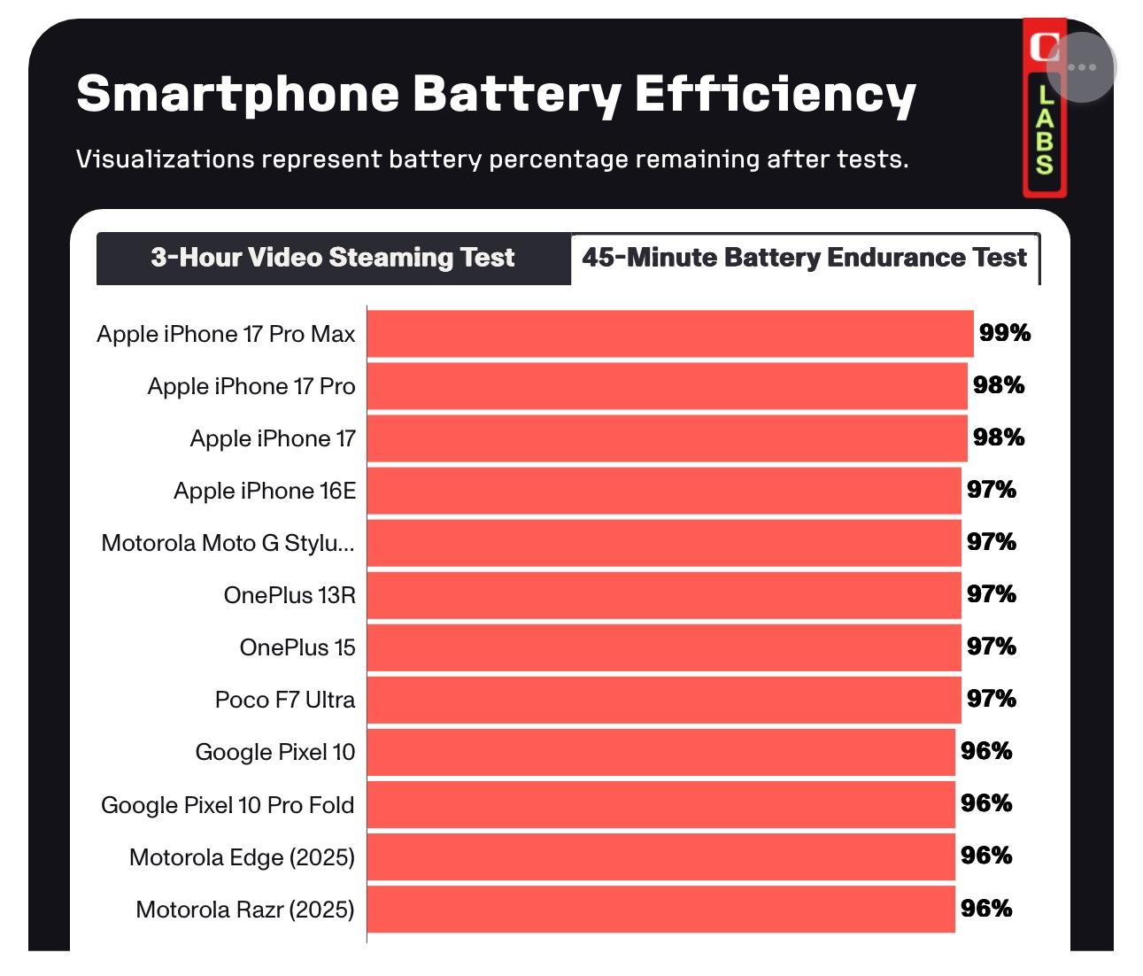 V prvním testu 3hodinového streamování videa s maximálním jasem obstál iPhone 17 Pro Max výborně, na konci mu zůstalo v akumulátoru 91 % energie, druhý se umístil OnePlus 15 (90 %), třetí byl základní iPhone 17 a OnePlus 15R (oba 89 %). Do první pětky se vešel i model Poco F7 Ultra od Xiaomi, nejlevnější z celé pětice.