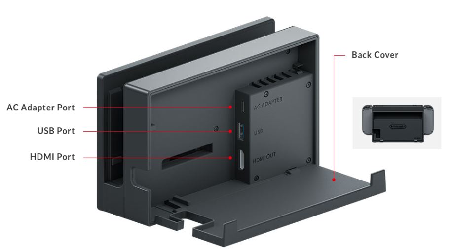 Na těle tabletu nalezneme stereoreproduktory, 3,5mm jack na sluchátka, USB-C pro nabíjení, tlačítka pro zapnutí/vypnutí a změnu hlasitosti a v neposlední řadě slot na herní karty; ty budou jedním ze zdrojů her, druhou možností je online distribuce. Na kratších stranách se pak ještě nachází kolejničky pro zasunutí ovladačů Joy-Con.