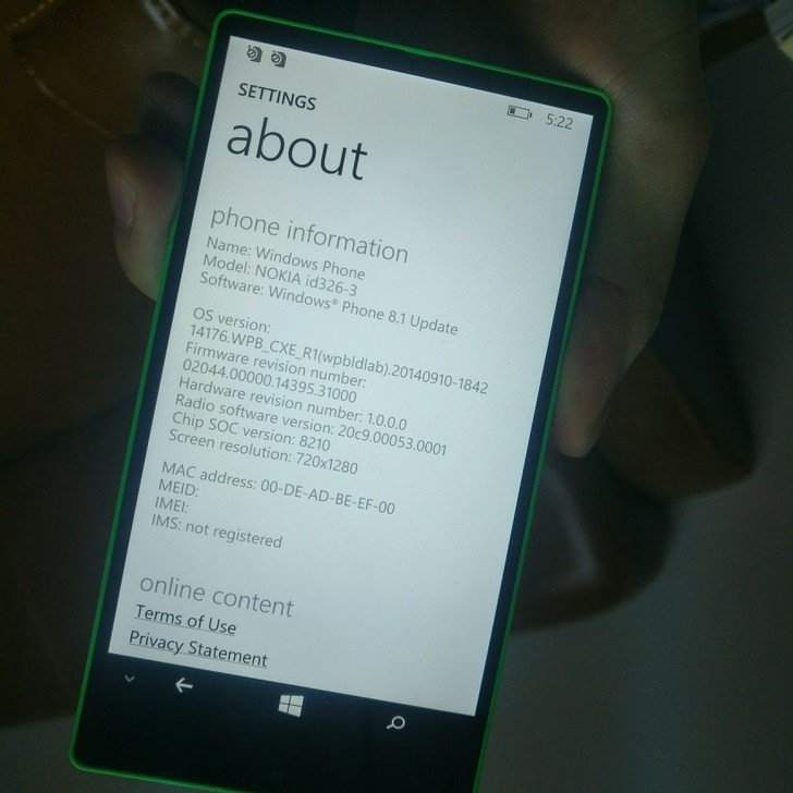 Telefon se totiž od někdejšího designového směru Lumií odkloňuje výrazně ztenčeným rámečkem při horní straně telefonu, což je záležitost zejména dnešních vlajkových lodí. Telefon na obrázcích je přitom zhruba dva roky starý a navíc se jedná o low-endový kousek s plastovou skořepinovou konstrukcí a vyjímatelnou baterií. Telefon měl pohánět čipset Qualcomm Snapdragon 200, rozlišení displeje mělo být 720 × 1 280 pixelů. Bohužel více informací o hardwarové výbavě telefonu, označovaného jako NOKIA id326-3, neznáme.