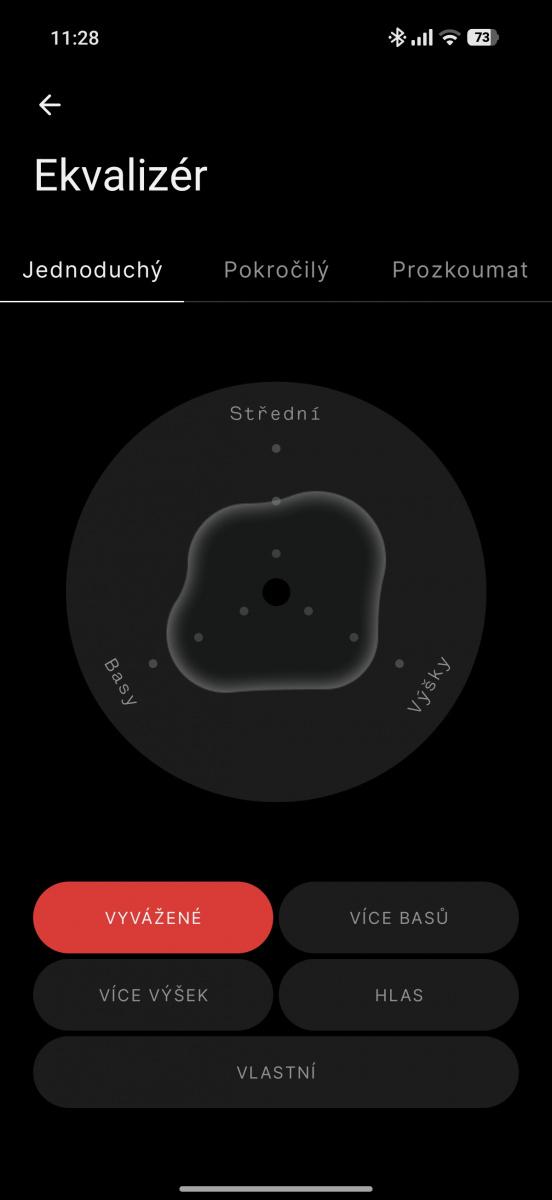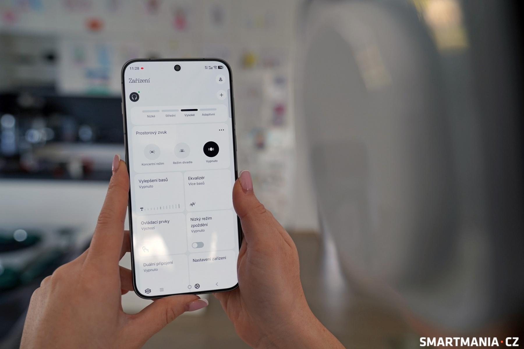 Nastavení a ovládání probíhá přes mobilní aplikaci Nothing X, která je přehledná a na používání poměrně příjemná. Všechny její hlavní prvky jsou situovány na hlavní obrazovce, kde si můžete přepínat režimy ANC a prostorového zvuku (koncert / divadlo / vypnuto), lze si pohrát s ekvalizérem nebo vylepšit basy.