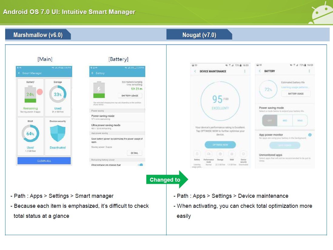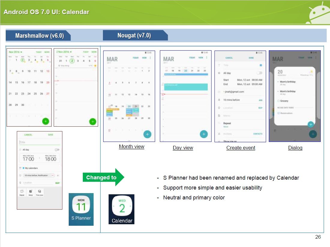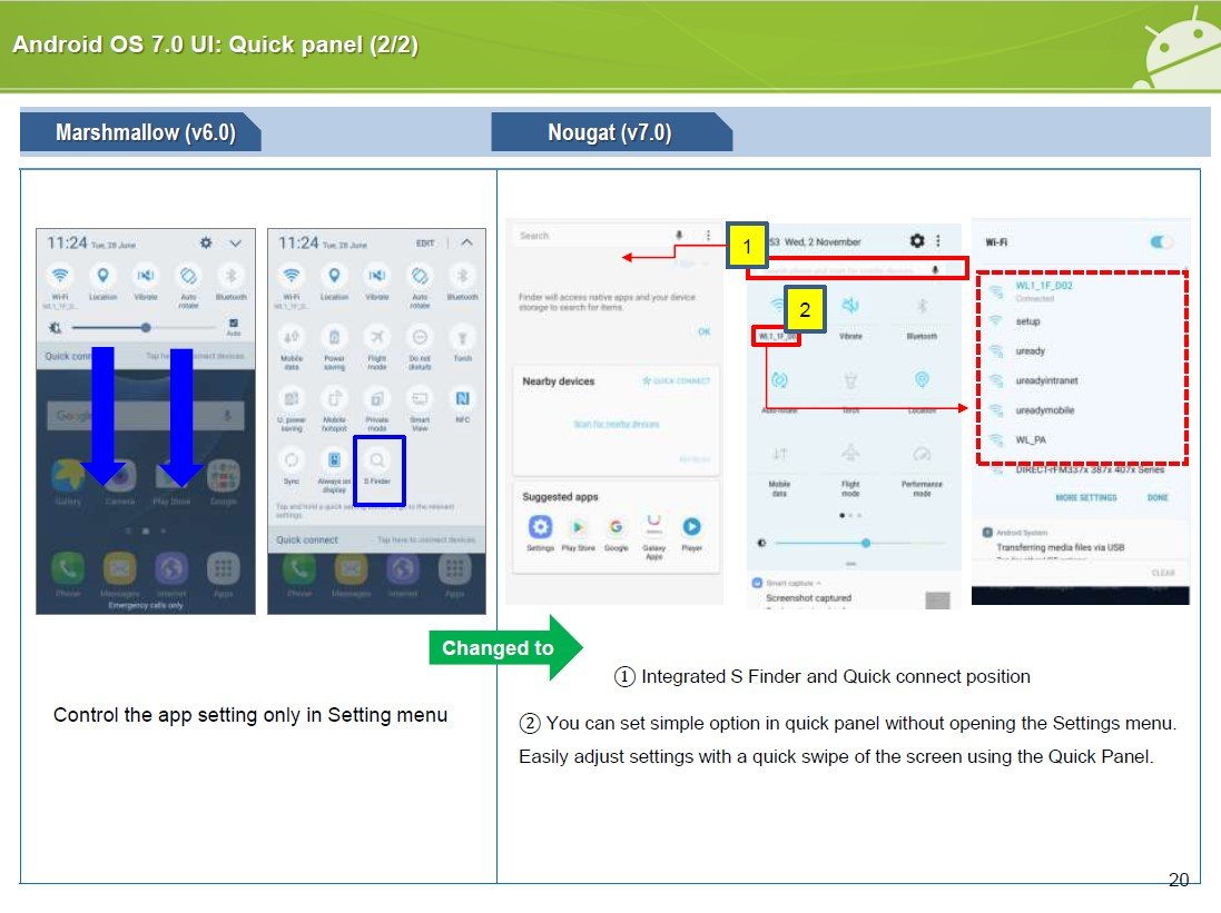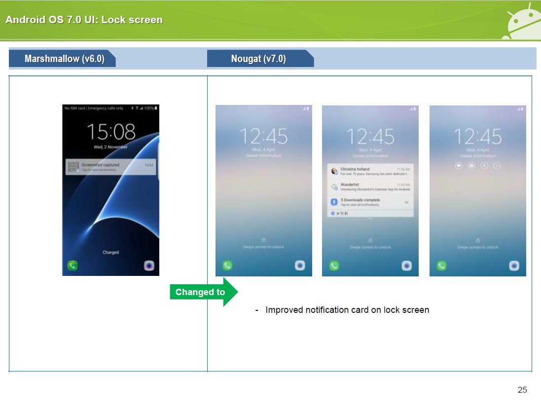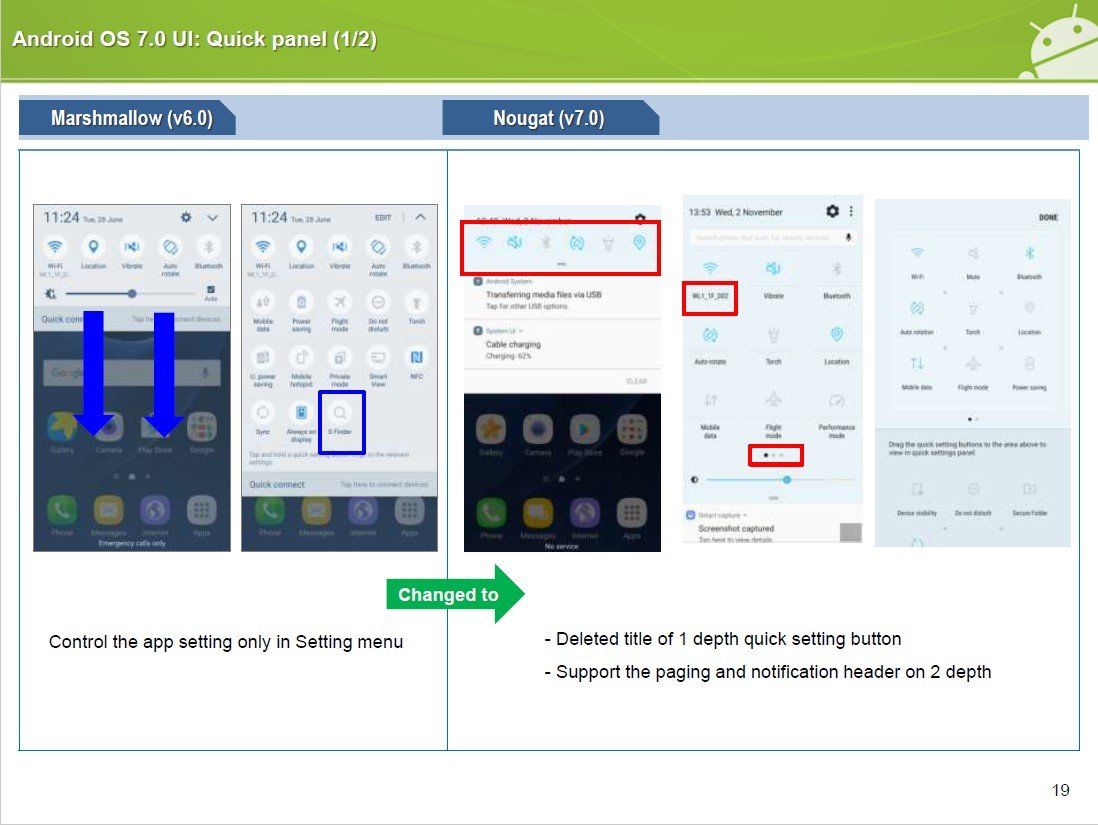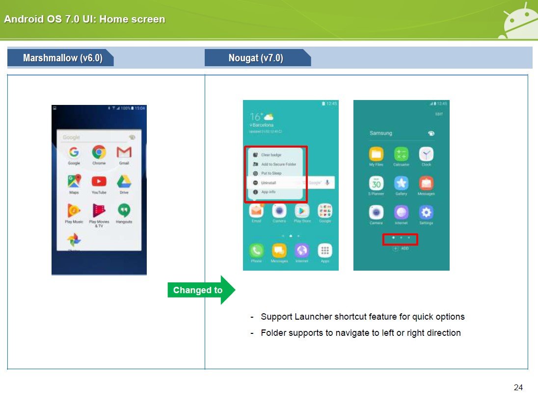 Společnosti Samsung se nepodařilo udělat „díru“ do světa s modelem Galaxy Note7, proto se alespoň snaží maximálně uspokojit stávající zákazník tím, že do Galaxy S7 & Galaxy S7 edge naservíruje co možná nejodladěnější software. Jaký bude nakonec výsledek se pravděpodobně dozvíme ještě tento rok – proslýchá se, že Samsung stihne novou verzi Androidu vydat ještě letos. Na snímcích níže se můžete podívat na všechny změny, které aktualizace přinese – vlevo je stará verze Marshmallow, vpravo pak nová verze Androidu Nougat. Jak se vám líbí?
