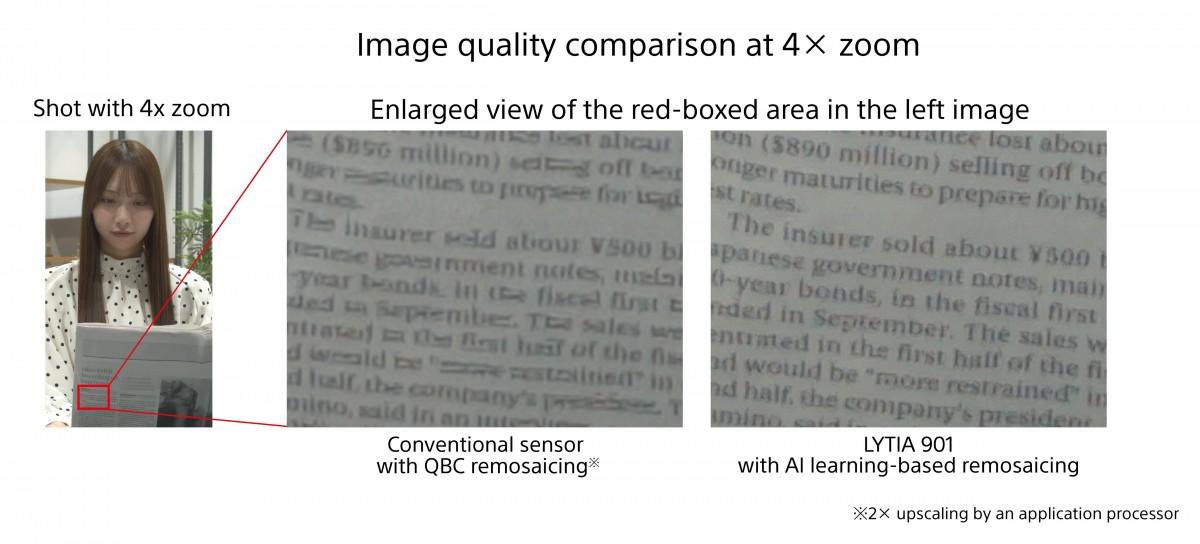 Díky vysokému rozlišení je také ve schopnostech tohoto čipu pořizovat 4× přiblížené snímky, aniž by bylo nutné nasazovat speciální optiku. Sony k tomu využívá technologii remosaic, která dokáže ze sloučených pixelů zrekonstruovat původní obraz tak, aby měl každý pixel správnou barvu a ostrost. Součástí fotočipu je navíc speciální obvod s umělou inteligencí, která napomáhá zpracování výsledného obrazu. Výsledkem má být perfektní reprodukce detailů, která je poznat především u jemných vzorů a písmen.