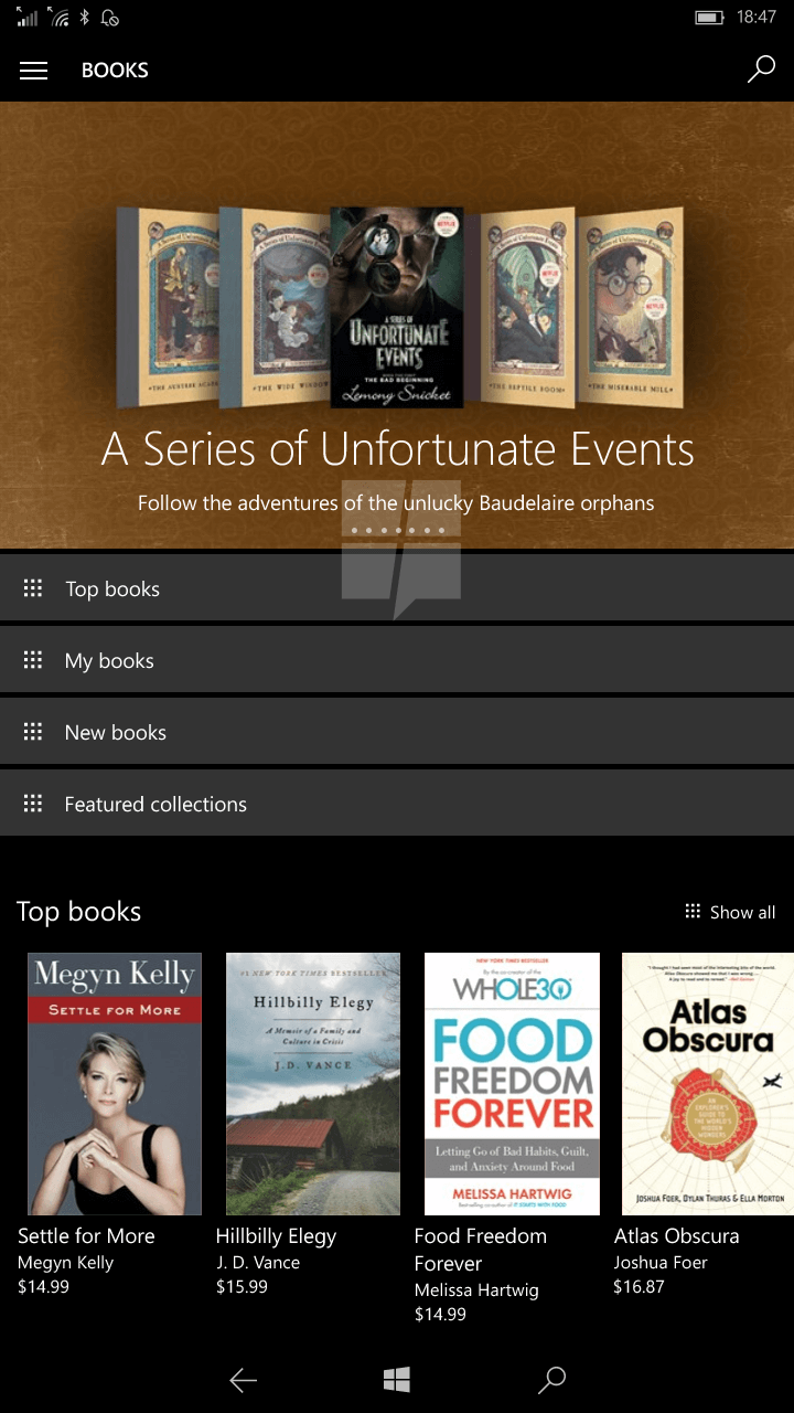 Obchod aplikací v obou verzích Windows je od aktuálního sestavení obohacen o prodej elektronických knih. Jako jejich offline čtečka poslouží prohlížeč Microsoft Edge, který dostává novou knihovnu, do níž se budou zakoupené knihy stahovat. Edge jako čtečka umožní používat menu kapitol, vyhledávat konkrétní slova, zanechávat záložky, přizpůsobit si písmo, Cortana dokonce může posloužit jako výkladový slovník.