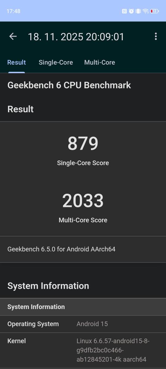 Malá ukázka – více než tisíc slov. V žebříčku AnTuTu v11 nasbíral námi testovaný model 577 tisíc bodů, v 3DMark Wild Life Extreme jen 350 bodů, v Geekbench v6 skórovala 879 body Single-Core a 2 033 body Multi-Core. Abyste měli reálné srovnání, hrubý výkon je na úrovni Redmi Note 12 z roku 2023, grafický na úrovni Redmi Note 14. Mírnou výhodou je, že většina zástupců v podobné cenové třídě – ať už od Motoroly, Infinixu, Realme nebo Honoru – na tom není o moc lépe.