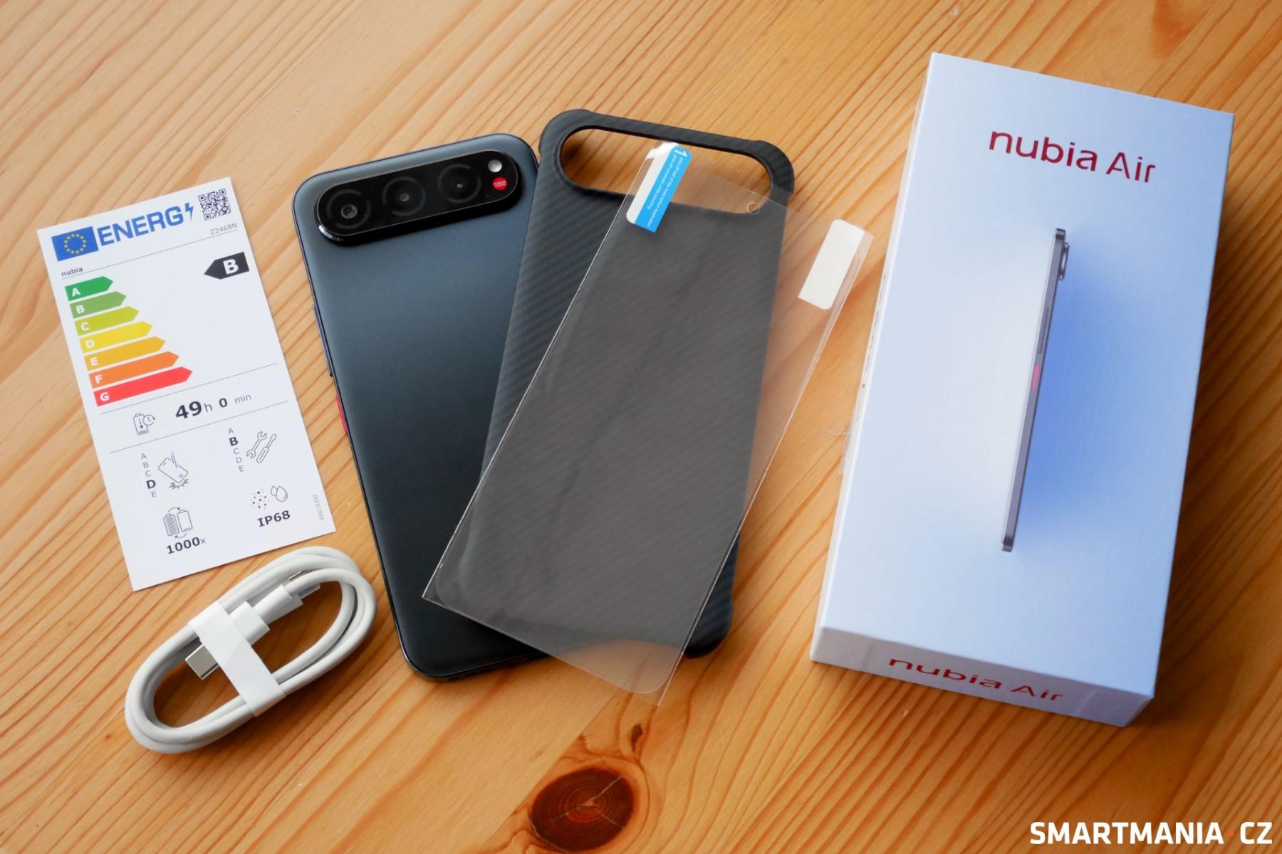 Ke cti výrobci jde, že potenciální zájemce nechce ochudit na prodejním balení. Nabíječku sice kvůli nařízení Evropské unie dodávat nesmí, jinak ale najdete v krabičce vše podstatné: telefon samotný, ochranný kryt s imitací karbonu, nalepovací fólii pro základní ochranu displeje, samozřejmě i sponku na SIM slot a energoštítek. Z něj se dozvíme, že Nubia Air má energetickou třídu B, odolnost třídy D, opravitelnost třídy B a že baterie vydrží nabitá 49 hodin. Tady jen lehké srovnání – iPhone Air i Samsung Galaxy S25 Edge dle energoštítku deklarují výdrž baterie na 40 hodin.