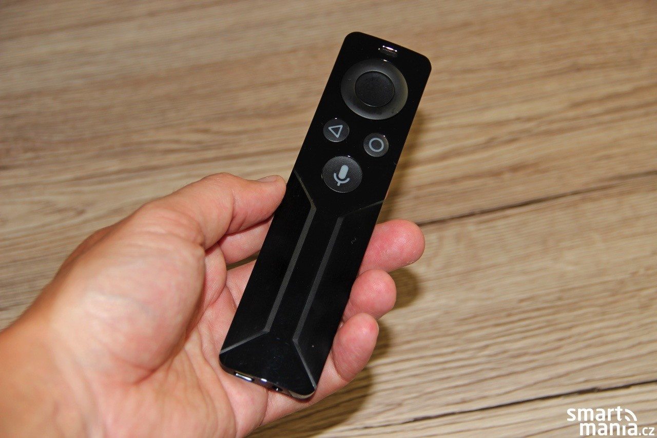 Do redakce jsme na test dostali i dálkový ovladač, který opět komunikuje přes Wi-Fi; ten je však nutné dokoupit samostatně. Na něm najdete 4 tlačítka a jeden čtyřsměrový kruh, bohatě však postačí pro základní navigaci v celém prostředí. Nechybí ani mikrofon či konektor pro sluchátka, což je velmi praktické, protože si skrze ovladač můžete po celém domě streamovat hudbu přímo z SHIELDu.