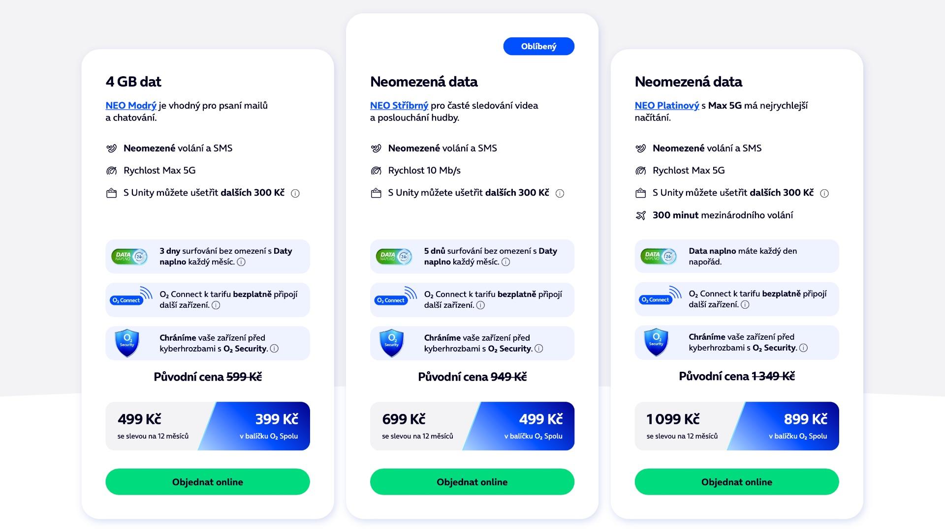 Nejvyšší Neo+ Platinový rychlost nemá kam zvyšovat, O2 zde slibuje „Maximální 5G rychlost“, v praxi údajně až 800 Mb/s. Původní cena byla 1 349 korun (1 099 korun v O2 Spolu), nově zaplatíte o 50 korun víc, tedy 1 399 korun, případně 1 199 korun pro zákazníky s kombinovanou nabídkou O2 Spolu.