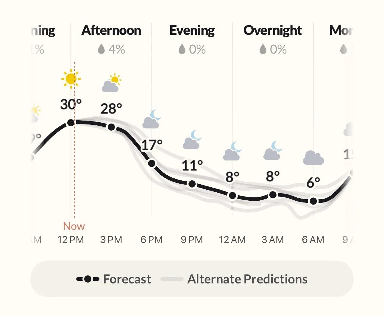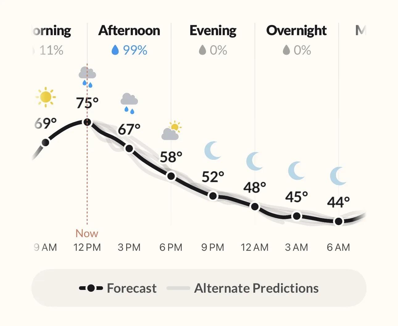 První způsob, jakým si Acme tuto funkci představuje, je v „alternativních budoucnostech“. Aplikace zobrazí předpověď, která bude podle ní ještě spolehlivější než ta používaná v Dark Sky, ale zobrazí také alternativní předpovědi, které ukážou, do jaké míry může být tato předpověď nesprávná. V zásadě platí, že hlavní předpověď je to, co se očekává, ale ostatní předpovědi jsou to, co je stále možné. Acme vysvětluje, že významný rozptyl v předpovědích ukazuje, jak může být předpověď nestabilní.
