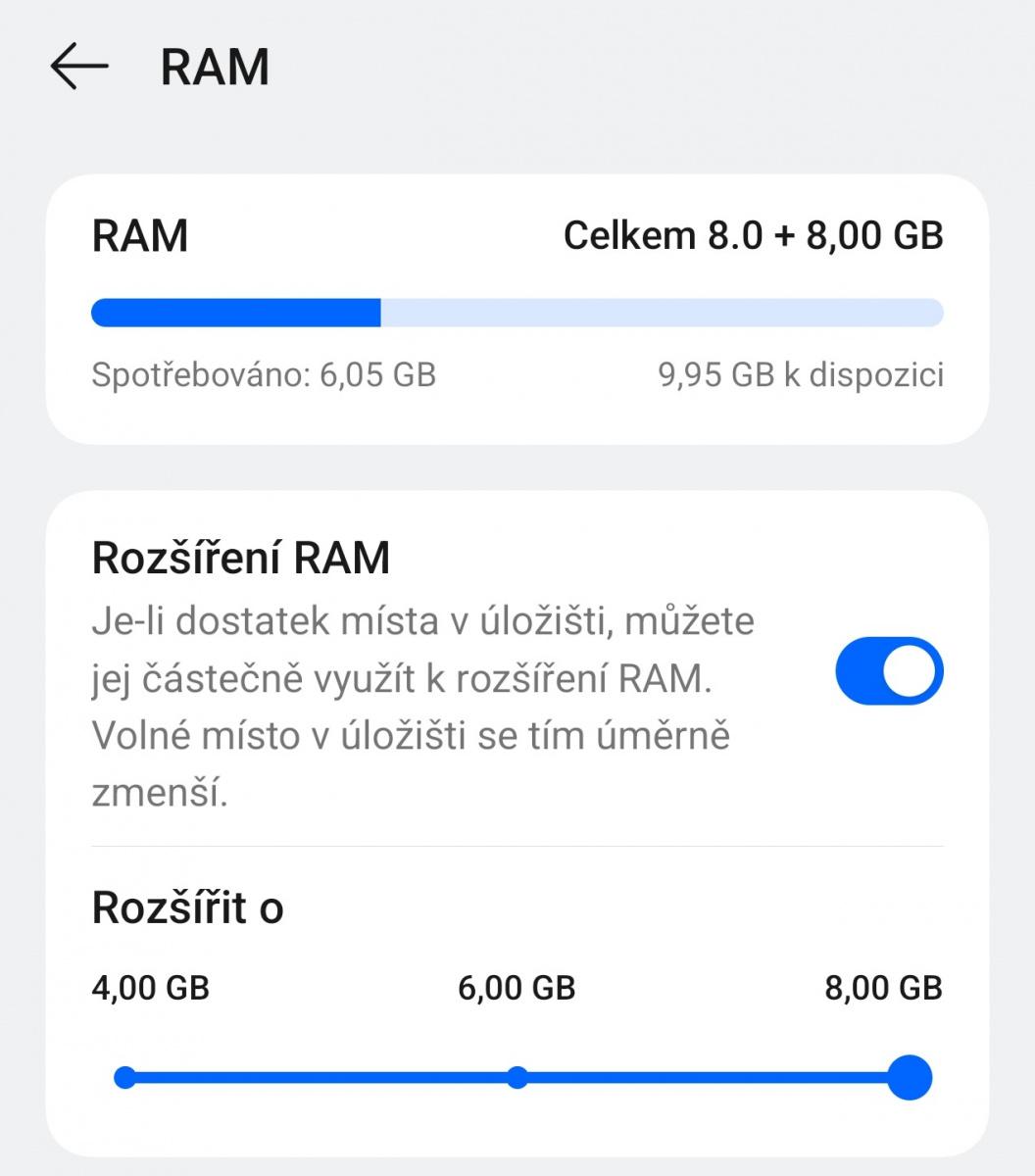 Drobnou výtku si výrobce zaslouží i za pomalejší úložiště typu UFS 3.1, přestože čipset podporuje rychlejší paměti UFS 4.0. Kapacitu úložiště je navíc nutné moudře vybrat už při nákupu, neboť paměťové karty telefon nepodporuje – my jsme na test dostali 256GB variantu, po spuštění zůstal pro uživatelská data prostor 215 GB. Z této hodnoty si ještě může telefon ukrojit pro účely virtuálního navýšení operační paměti – u testovaného modelu bylo maximem 8+8 GB, model s 512GB úložištěm umí nabídnout 12+12 GB.