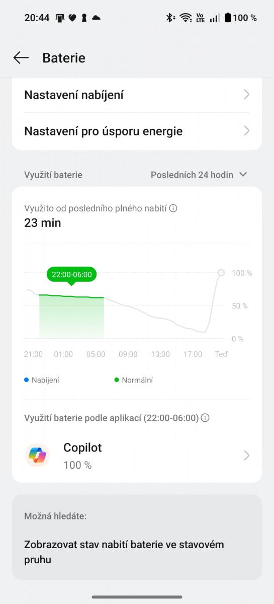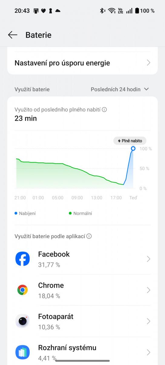 Samozřejmě pokud potřebujete doplnit energii co nejrychleji, máte k dispozici rychlé nabíjení SuperVOOC s výkonem 80 wattů, který dokáže akumulátor dobít z nuly na 100 procent za necelých 45 minut. Tento mód si ale musíte manuálně aktivovat.