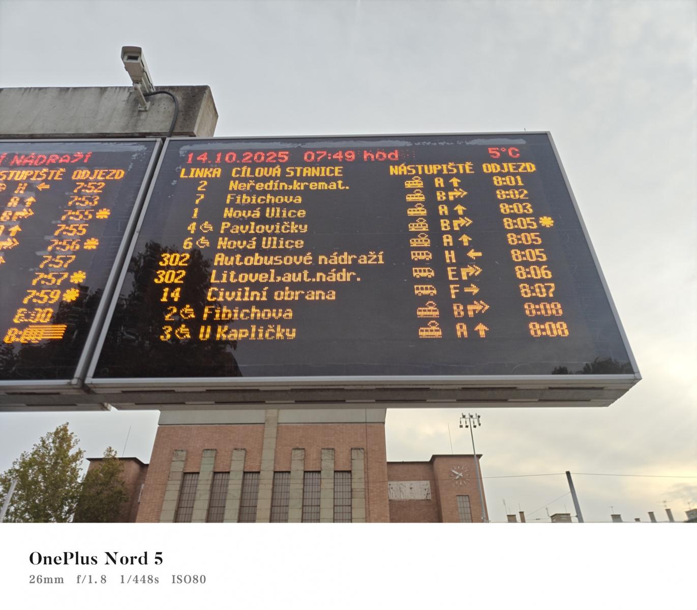 (Nejen) ve nočních hodinách jsem si rovněž oblíbil režim Dlouhá expozice. Není potřeba složitě hledat ideální čas závěrky – v tomto módu jednoduše začnete fotit a živě na displeji sledujete, jak se postupně prodlužují cesty světel jedoucích automobilů nebo vyhlazuje proud tekoucí vody. Jakmile jste s průběžným výsledkem spokojeni, stačí podruhé stisknout spoušť. V tomto režimu lze rovněž fotografovat digitální informační tabule (typicky časy odjezdů), u nichž se kvůli obnovovací frekvenci diod ve standardním módu vykreslují pouze jednotlivé řádky. Prodloužením závěrky lze postupně vyfotit informace na displeji celé.