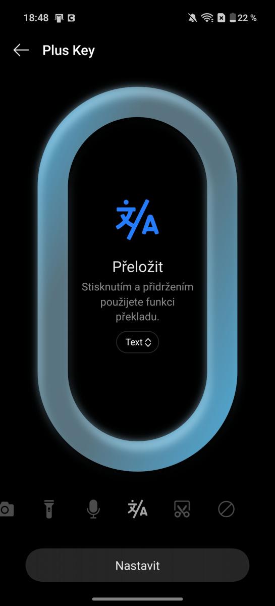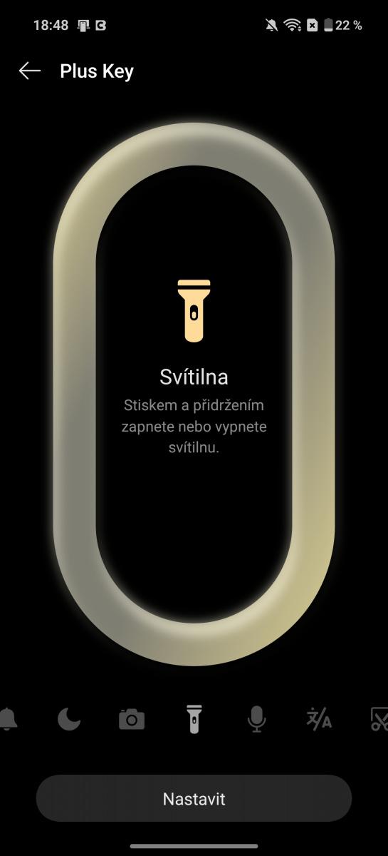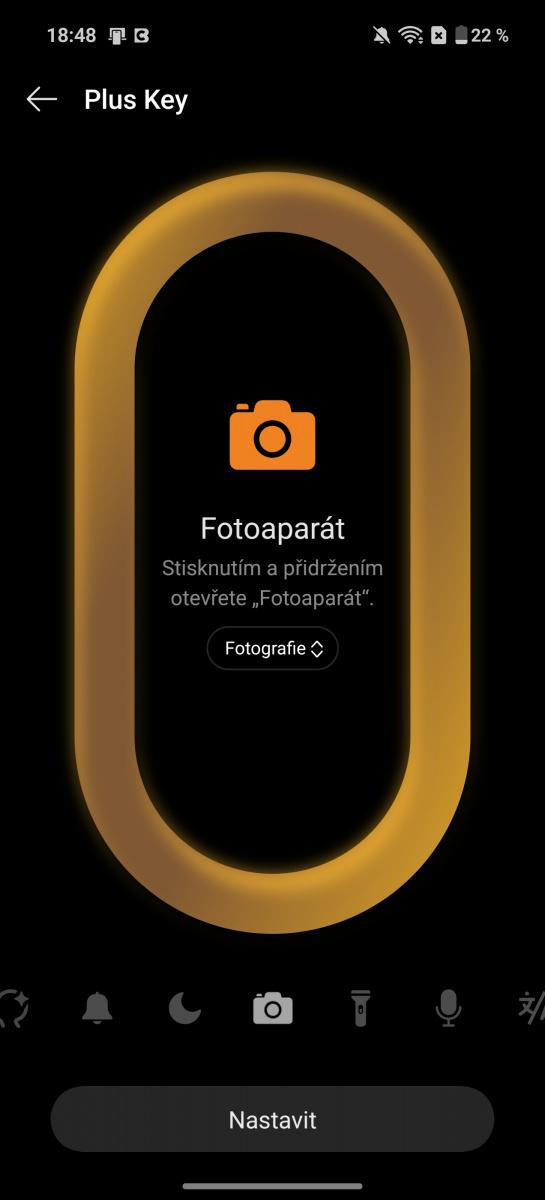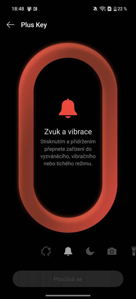 Když už je řeč o ovládacích prvcích, musím zmínit i kontroverzní výměnu posuvného přepínače profilů za „programovatelné“ tlačítko Plus Key. Čínský výrobce se v tomto inspiroval u společnosti Apple, která podobou výměnu u iPhonů podstoupila předloni. Tlačítko má nejen podobné funkce jako jeho jablečný protějšek (změna profilů, aktivace svítilny, spuštění fotoaparátu apod.), podobně vypadá i jeho nastavení, které nijak nekoresponduje se zbytkem systému.