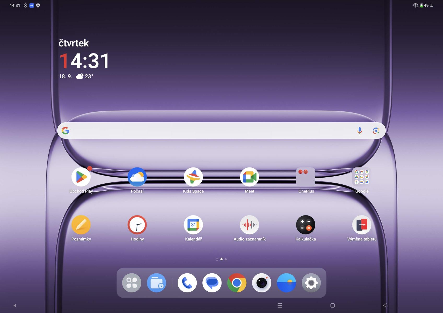 Pad 3 používá OxygenOS 15 a jedná se o velmi minimalistickou nástavbu Androidu. K jeho základní formě přidává jen lehce přeskládané menu a ojedinělé formy přizpůsobení grafiky. Většinu nadstandardních prvků obsluhuje jen launcher s lištou pro poslední aplikace a dokumenty, který duplikuje boční vysouvací lišta.