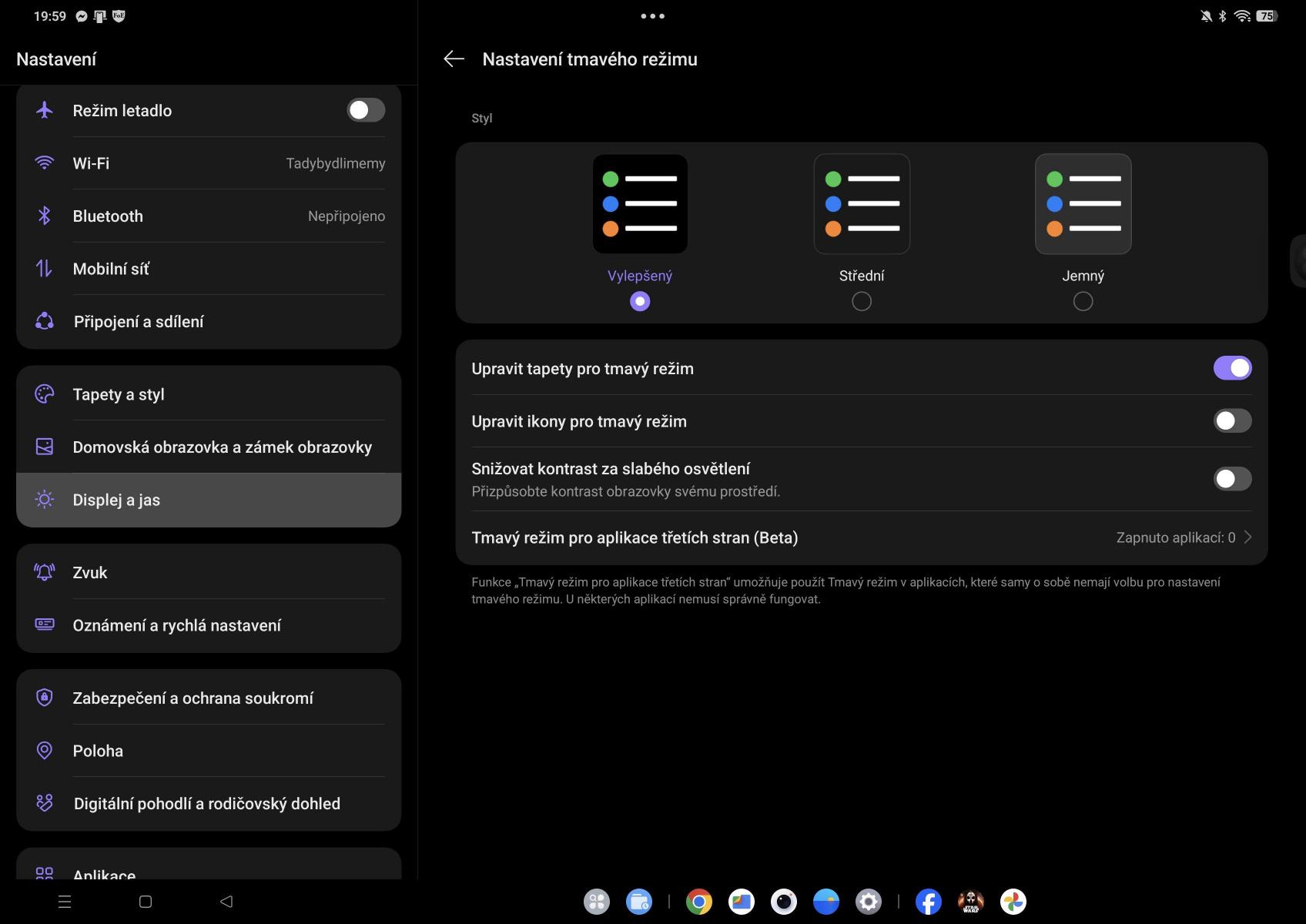 Bohužel za tohle může víc Google než Oneplus. Tak dlouho odmítal rozdělovat telefonní a tabletové rozhraní a když už ho akceptoval, podmínil ho hranicí v DPI, že na něj spousta vývojářů rezignovala. Zároveň ani nemůžu Oneplus obhajovat, že by šlo Androidu nějak naproti. Existuje možnost si v nastavení displeje změnit rozvržení aplikace v orientaci na šířku, ale ne každá aplikace tyto volby podporuje. Po pravdě, s výjimkou FB a IG a aplikací od Oneplus je nepodporovala žádná z nainstalovaných. Částečnou náhradou je gesto stažením čtyř prstů, které aplikace směstná tak, aby byl vidět obsah z obou, ale pak zase nemusí vyhovovat měřítko.