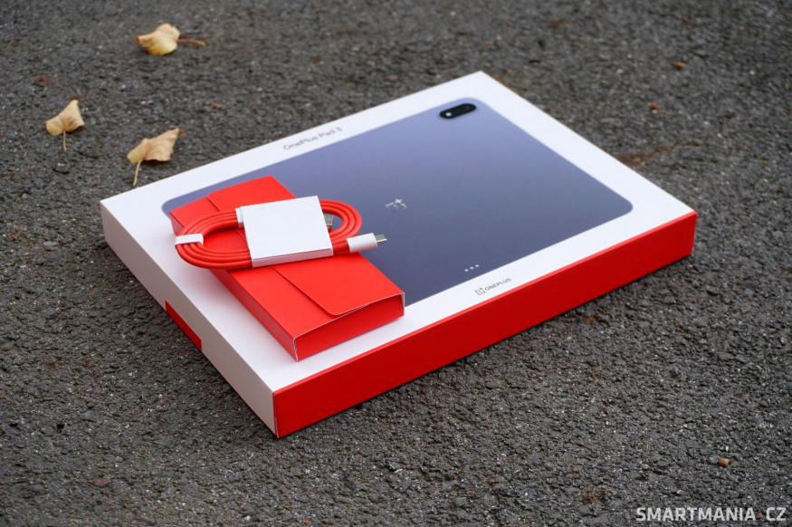 Oneplus používá červenou barvu historicky. Nenajdete ji sice na samotných zařízeních, kde se mihne leda jako akcent na widgetu, ale krabička celého zařízení díky jejímu použití vypadá jako bonboniéra Merci. Obsah možná není tak chutný, ale zase nemá datum spotřeby uvedené na obalu. Čokolády uvnitř však není moc. Jen tablet samotný a nabíjecí kabel. Trochu vás namlsá vyobrazení pera na papíru, ale text hned vedle upozorní, že se stylus prodává samostatně.