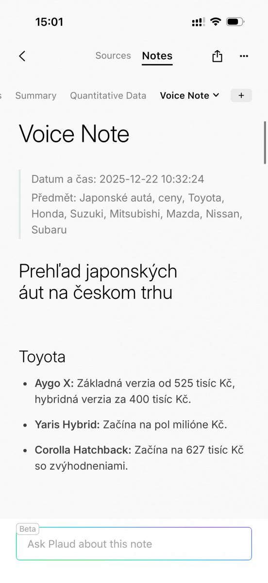 Pro rozehřátí jsem mu ovšem jeden scénář vymyslel. Pro účely testování jsem zaznamenal přibližně desetiminutový monolog na téma cenově dostupných japonských vozidel na českém trhu, přičemž jsem na toto téma mluvil bez přípravy z patra, a ani jsem se nesnažil své myšlenky nijak zvlášť třídit, proč taky, když to za mě může udělat AI. Výsledek byl uspokojivý odhadem z 90 procent – většinu informací pochopil správně, avšak jeden z klíčových závěrů pochopila AI naprosto obráceně a část shrnutí jsem z nějakého důvodu dostal ve slovenštině.