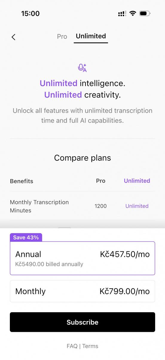 Předplatné je jistě také ožehavé téma. Se zakoupeným Plaudem Note Pro máte automaticky zdarma 300 minut záznamu (pět hodin, pokud se vám to nechce počítat) každý měsíc, takže pokud vám to stačí, gratuluji, jste bez dodatečných nákladů. Jestli ale budete chtít používat intenzivněji, počítejte s měsíčním poplatkem 499 korun měsíčně, respektive 2790 korun ročně (232,5 korun měsíčně) za 1200 minut měsíčně (dvacet hodin záznamu), nebo 799 korun měsíčně, případně 5490 korun ročně (457,5 korun měsíčně) za neomezený čas. I když se předplatná liší jen v dostupném čase a ne v dostupných funkcích (což chválím) – ruku na srdce, není to zrovna málo.