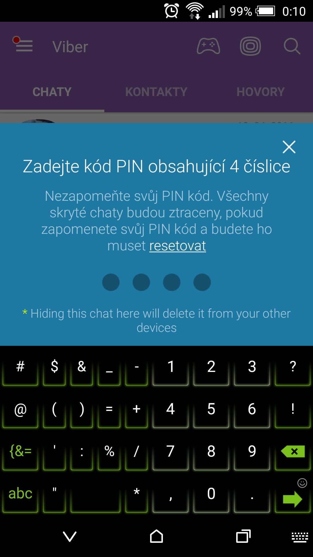 Stejnou cestou se nyní vydává i další aplikace zaměřená na komunikaci – Viber. Ten ve verzi 6 přináší zmíněné šifrování komunikace, k tomu ale přidává ještě jednu funkci, a to skrytí konverzace. Ta je poté přístupná pouze po zadání 4místného PIN kódu, který si sami zvolíte. Pokud jej zapomenete, veškeré skryté konverzace se nenávratně smažou. Pro nalezení skrytých konverzací pak stačí napsat PIN do vyhledávacího pole.