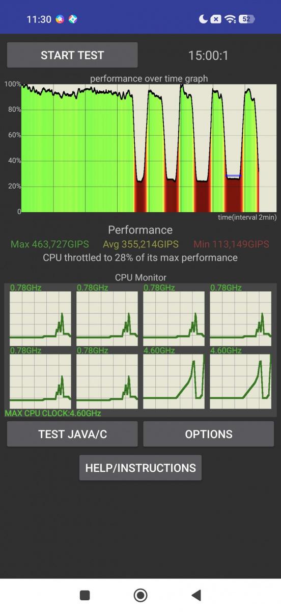 V tabulce tak sice máte pořád dvě jádra Oryon V3 Phoenix L na 4,6 GHz a šest Phoenix M na 3,62 GHz, ale nikdy nevíte, kdy nastane okamžik, kdy hodí ručník do ringu. U každého procesoru dochází k throttlingu, dokonce není ani výjimkou, že po dvou minutách zátěže klesne výkon na polovinu, ze které se už do vypnutí nevyhrabe, ale lítat mezi 25 a 90 % každých pár minut o rozumném vyladění nesvědčí. Zkusil jsem samozřejmě i 3DMark Wild Life Extreme Stress test a dopadl černou obrazovkou s jasným sdělením: telefon je přehřátý a na test mi kašle. To není dobrá vizitka.