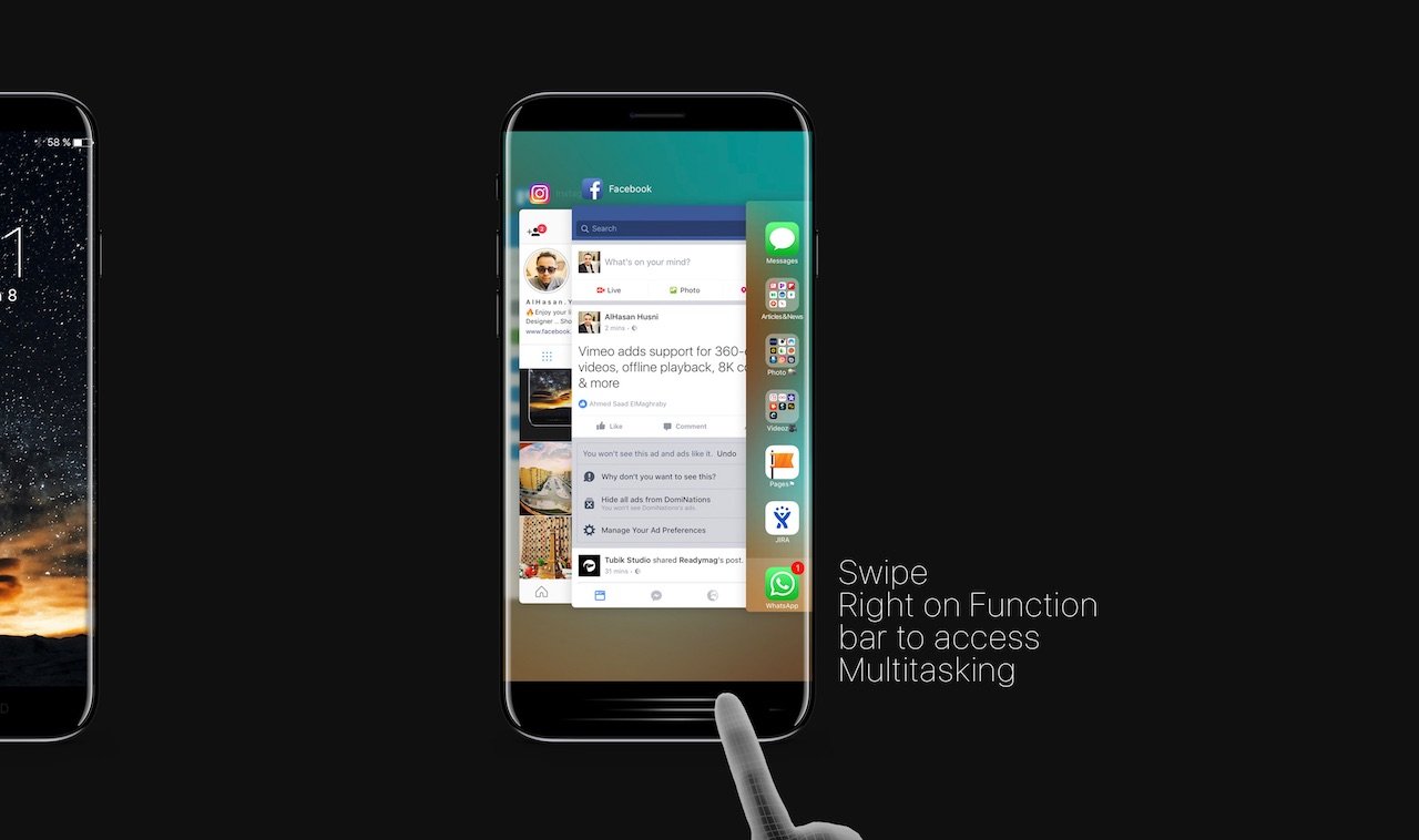 Ačkoliv vypadá koncept věrohodně a velice pěkně, nejvíce pozornosti poutá speciální dotykový panel na bradě telefonu. Ten by měl rozšířit možnosti ovládání iPhonu a zároveň by v sobě měl mít zabudovanou čtečku otisků prstů Touch ID s haptickou odezvou. V neposlední řadě lze vidět představu designéra o iOS 11, který by měl být po letech obohacen o tzv. Tmavý režim (Dark mode) známý z desktopového systému macOS.