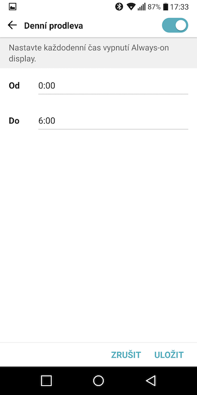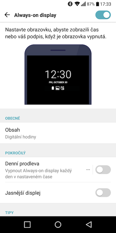 U LG G6 je pro funkci „AOD“ nutné, aby bylo podsvícení displeje konstantně zapnuté, což s sebou samozřejmě nese výrazně vyšší spotřebu baterie, kterou se výrobce snažil alespoň částečně eliminovat tím, že pro „AOD“ poměrně dramaticky snížil jas. Ten si můžete v nastavení nastavit na vyšší hodnotu, avšak je potřeba počítat s rychlejším vybíjením baterie.
