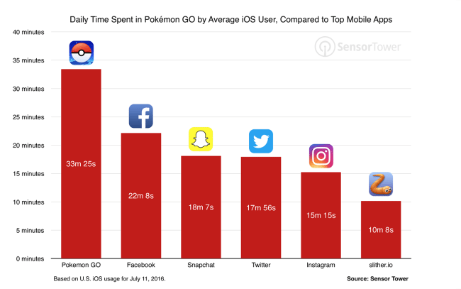 Podle analýzy společnosti Sensor Tower překonávají hráči Pokémon GO dokonce i největší sociální síť Facebook. Z grafu lze vyčíst, že se chytání Pokémonů věnuje hráč denně v průměru až 33 minut a 25 sekund, přičemž na Facebooku je uživatel průměrně 22 minut a 8 sekund. Zajímavější by však byla čísla až po nějaké době, co se počty hráčů ustálí a boom pomine.