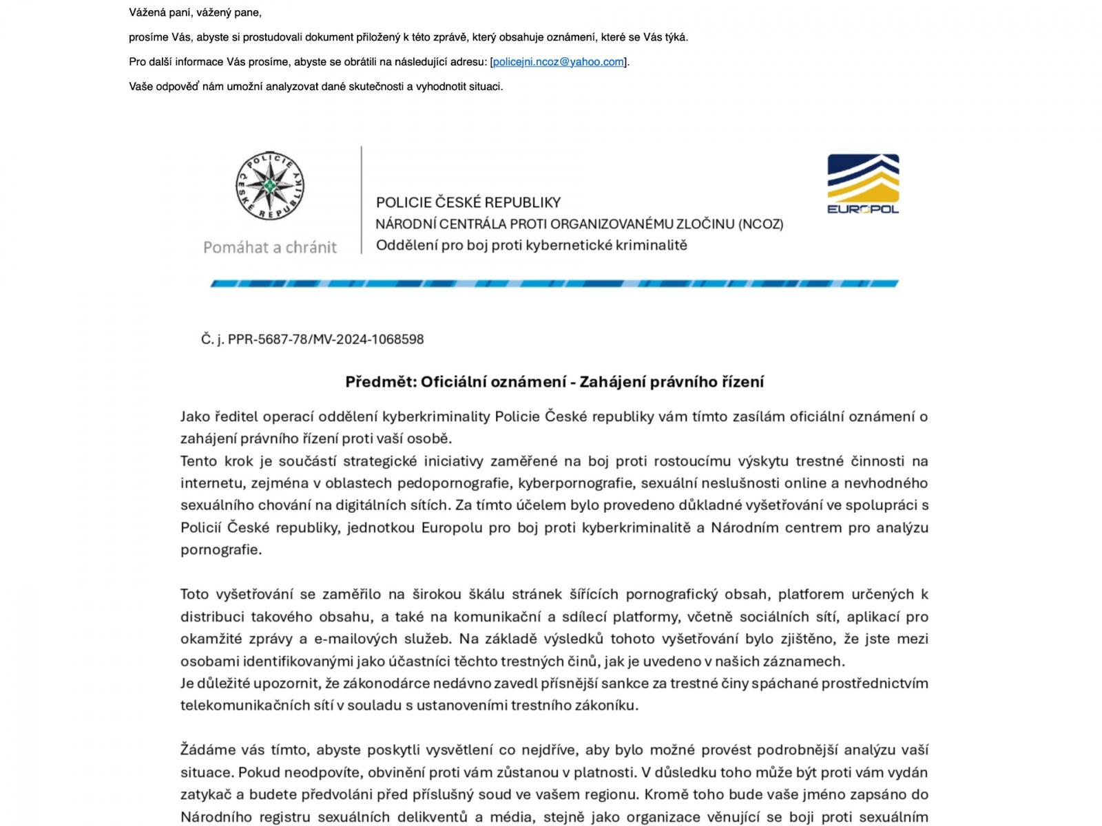 Na první pohled fundovaně sepsaný dopis hovoří o celoevropské vyšetřování ilegálního šíření pornografie. Policie České republiky (PČR) se pro tyto účely měla spojit s Europolem a „jako na potvoru“ jste zrovna vy v policejních seznamech jako osoba podílející se na této trestné činnosti.